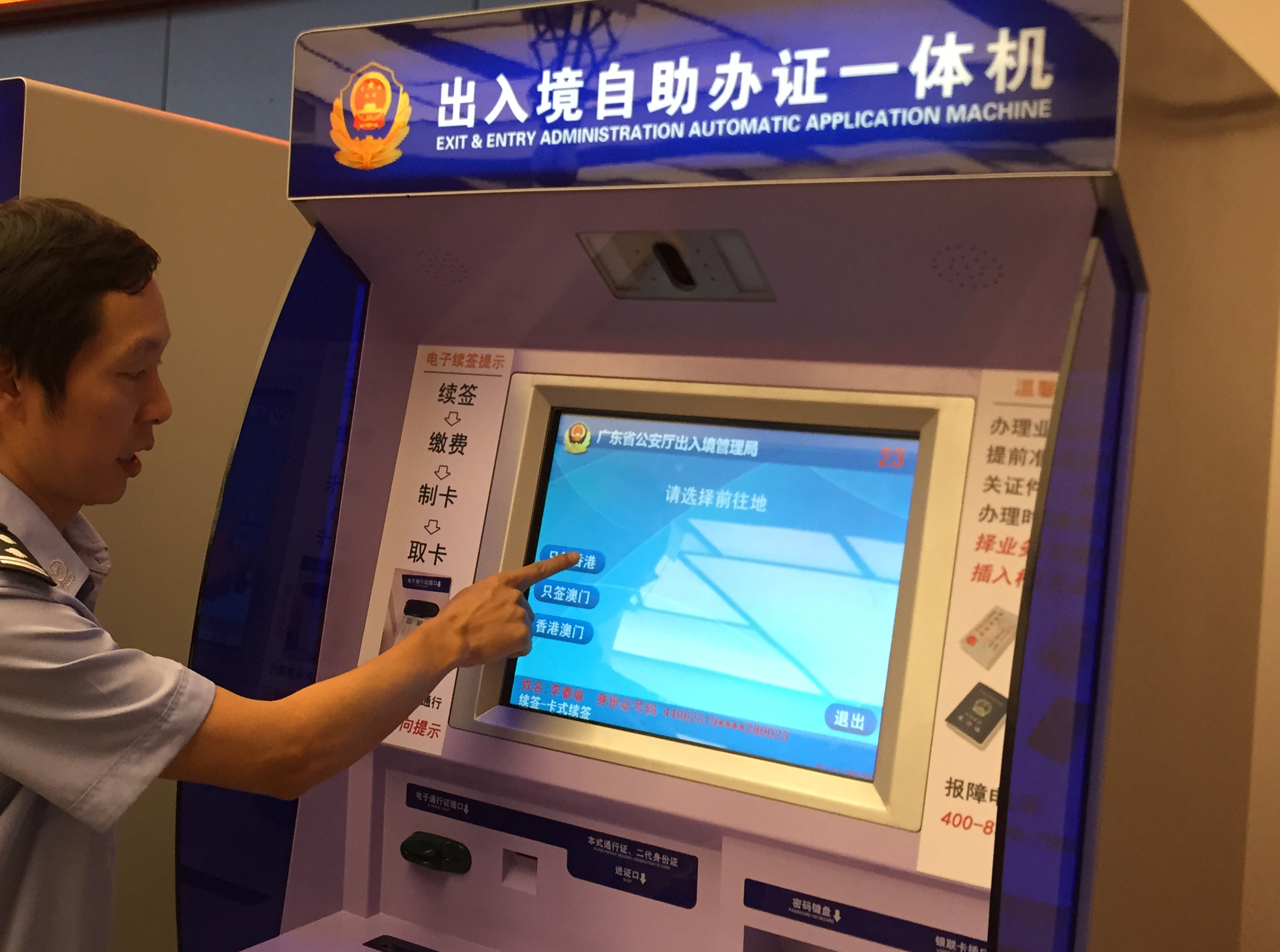 在自助服務點,市民可通過自助申請設備,提供證照相拍攝、申請信息提交、指紋和電子簽名採集、現場人像拍攝、繳費和回執打印的全流程自助申請,可辦理護照、港澳台通行證及港澳台簽註等多項業務,使用過程無需人工干預。操作完成後,最後到核驗枱面見核驗,就可以等待證件速遞上門。出入境部門人士也提醒,針對疫情時期,部分辦證政策會有所調整,部分自助辦證手續或流程以相關部門公布為準。