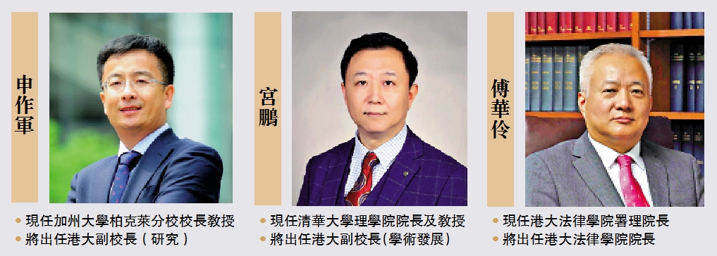 據大公報報道,香港大學校務委員會昨日宣布任命兩位副校長及一位院長,分別是申作軍為副校長(研究),宮鵬為副校長(學術發展),傅華伶為法律學院院長,各人任期皆為五年。