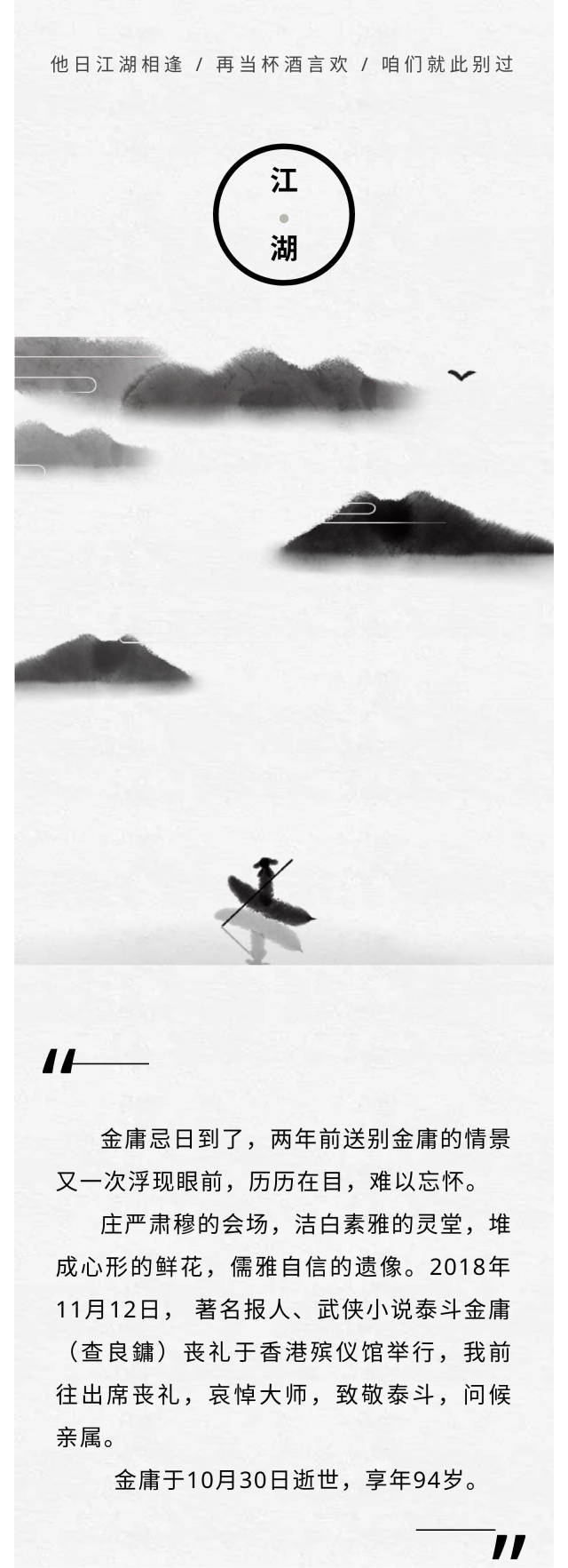 金庸喪禮日那天,我留意到家屬致送的紀念冊尾頁用心地引用了《神鵰俠侶》中洒脫豪放的名句:「他日江湖相逢,再當杯酒言歡,咱們就此別過。」讀之令人深深嘆息。一代大俠,從此絕跡江湖,再無他日,再無美酒,無牽無掛,無影無蹤……
