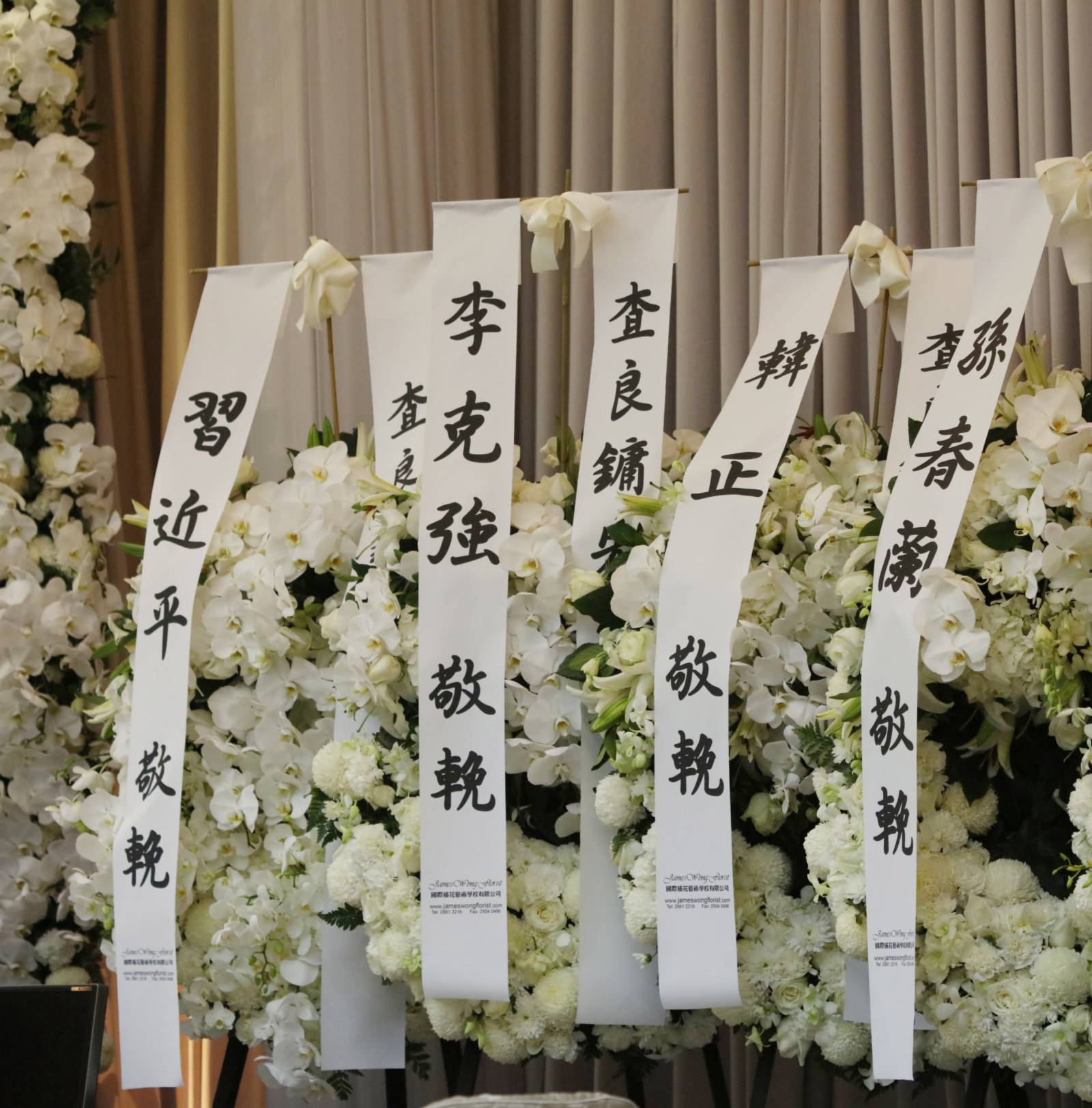 我看到靈堂四周擺滿了花圈,國家主席習近平等黨和國家領導人致送的花圈擺放在靈堂右側的顯著位置,林鄭月娥等特區政府官員和社會知名人士致送的花圈擺在靈堂左側,中間擺放的是查太太和金庸兒女的花圈。花圈很精緻,多用白百合、白玫瑰、白菊花和蝴蝶蘭等鮮花綴飾製成,上插悼語牌匾或懸掛致敬輓聯。