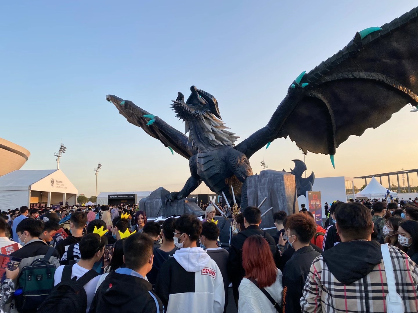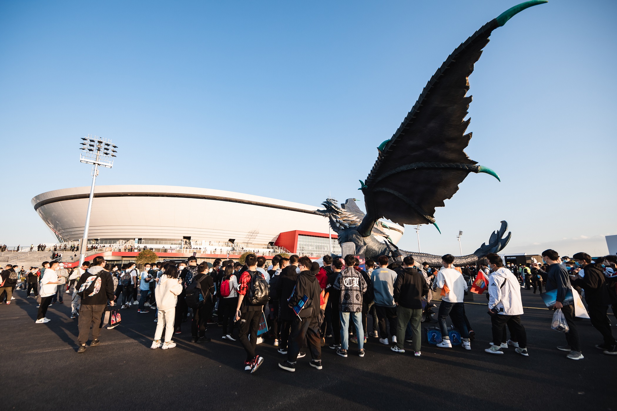 上汽浦東足球因獨特的外形,被稱為「白瓷碗」,作為國內最新最先進的足球場館,項目在建設過程中,將BIM技術、無人機實景掃描、AR增強現實技術、智慧工地等先進技術與現代化的設計風格融為一體,志在為現場觀眾能夠帶來身臨其境的競技體育觀賽體驗。同時,場館內部配備的專業電競配套設施,使之成為上海又一標誌性電競賽事場館。在通信需求方面,足球場安裝了600多副全向和定向天線,實現了5G+4G信號的全覆蓋。同時,在場館的室外,全球總決賽主辦方還為來到現場觀賽的粉絲提供了互動區域,《英雄聯盟》產品中各種標誌性元素的雕塑、粉絲應援牆、英雄聯盟賽事十年歷史回顧展、決賽戰隊合影牆等裝置,讓到達現場的粉絲能夠再次感受線下比賽的氛圍。開賽前,外場那隻高8米,翅展逾20米的大型實體「遠古巨龍」吸引了眾多粉絲合影留念。