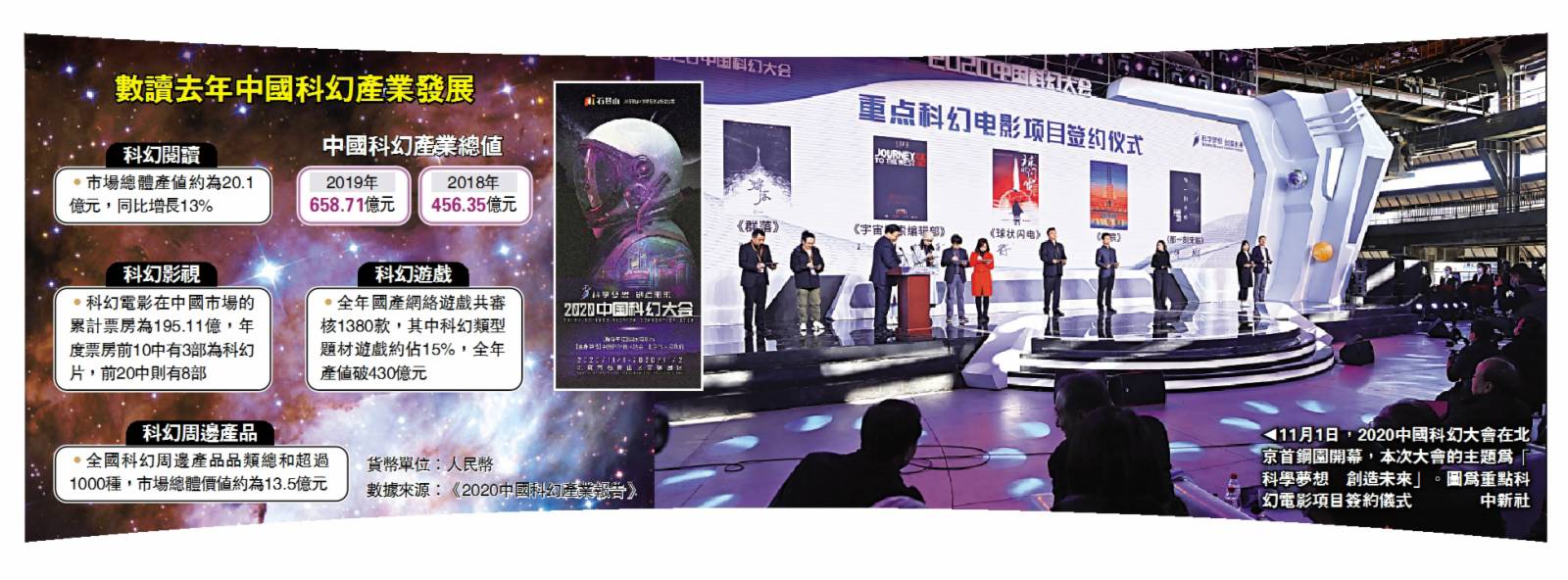 (大公報記者 馬曉芳 北京報道)從《三體》中讓無數讀者印象深刻的銀色「水滴」雕塑,再到《流浪地球》中同款的宇航服……11月1日在北京首鋼園開幕的2020中國科幻大會上,聲色不停的科幻視覺盛宴,投射未來世界,令人目不暇接。不僅如此,在特設的VR體驗區、虛擬現實體驗區,觀眾們更能借助科技手段,探索未來創科應用。據悉,2019年中國科幻產業總產值達658.71億元(人民幣,下同),較2018年的456.35億元增長44.3%,以此高速增長態勢,建立千億級產業指日可待。