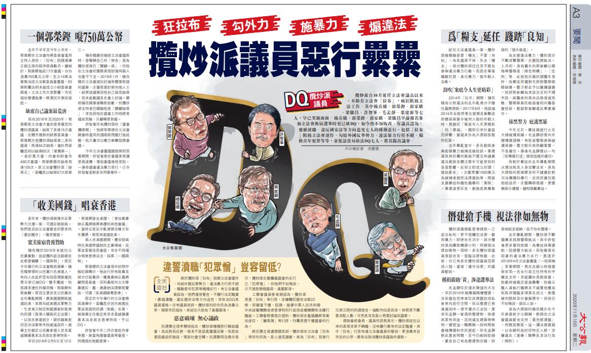 (大公報記者 冼國強 報道)攬炒派自10月延任立法會議員以來,不斷在立法會「拉布」,瘋狂阻撓立法工作。其中楊岳橋、郭榮鏗、郭家麒、梁繼昌、許智峯、毛孟靜、葉建源等七人,早已劣跡斑斑。楊岳橋、郭榮鏗、郭家麒、梁繼昌早前報名參加立法會換屆選舉時更已被DQ,如今仍不知悔改。有議員認為,應循瀆職、違反國安法等方向追究七人的種種惡行,包括「拉布」阻撓立法會運作、勾結外國反華勢力、違法暴力行徑不絕、煽動青年犯罪等等,並促請當局依法DQ七人,將其踢出議會。
