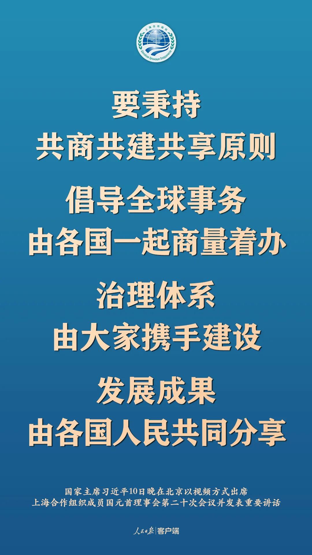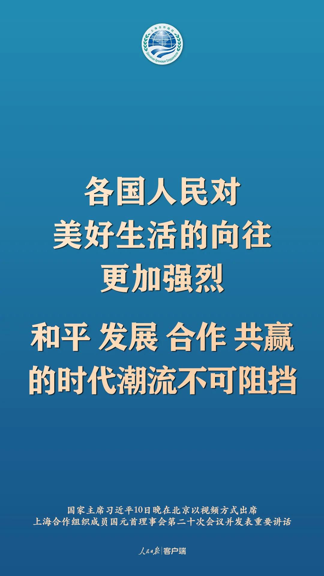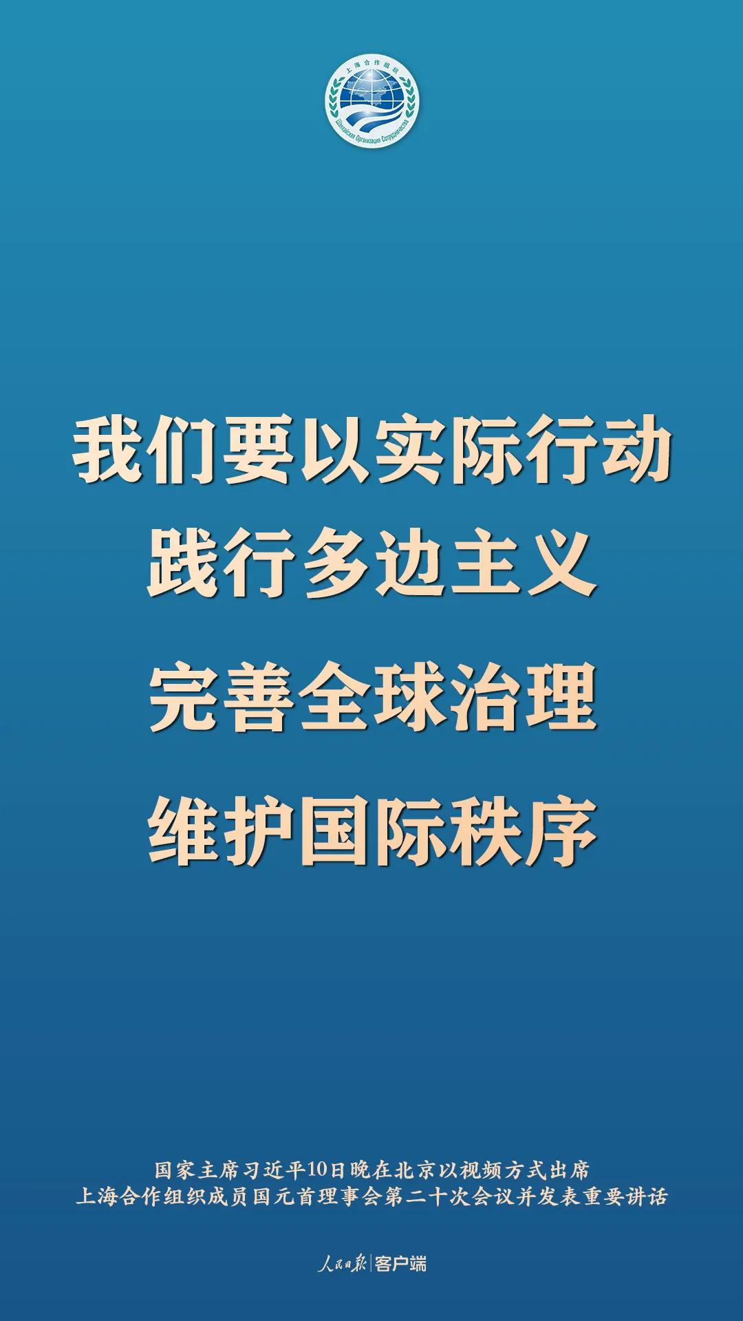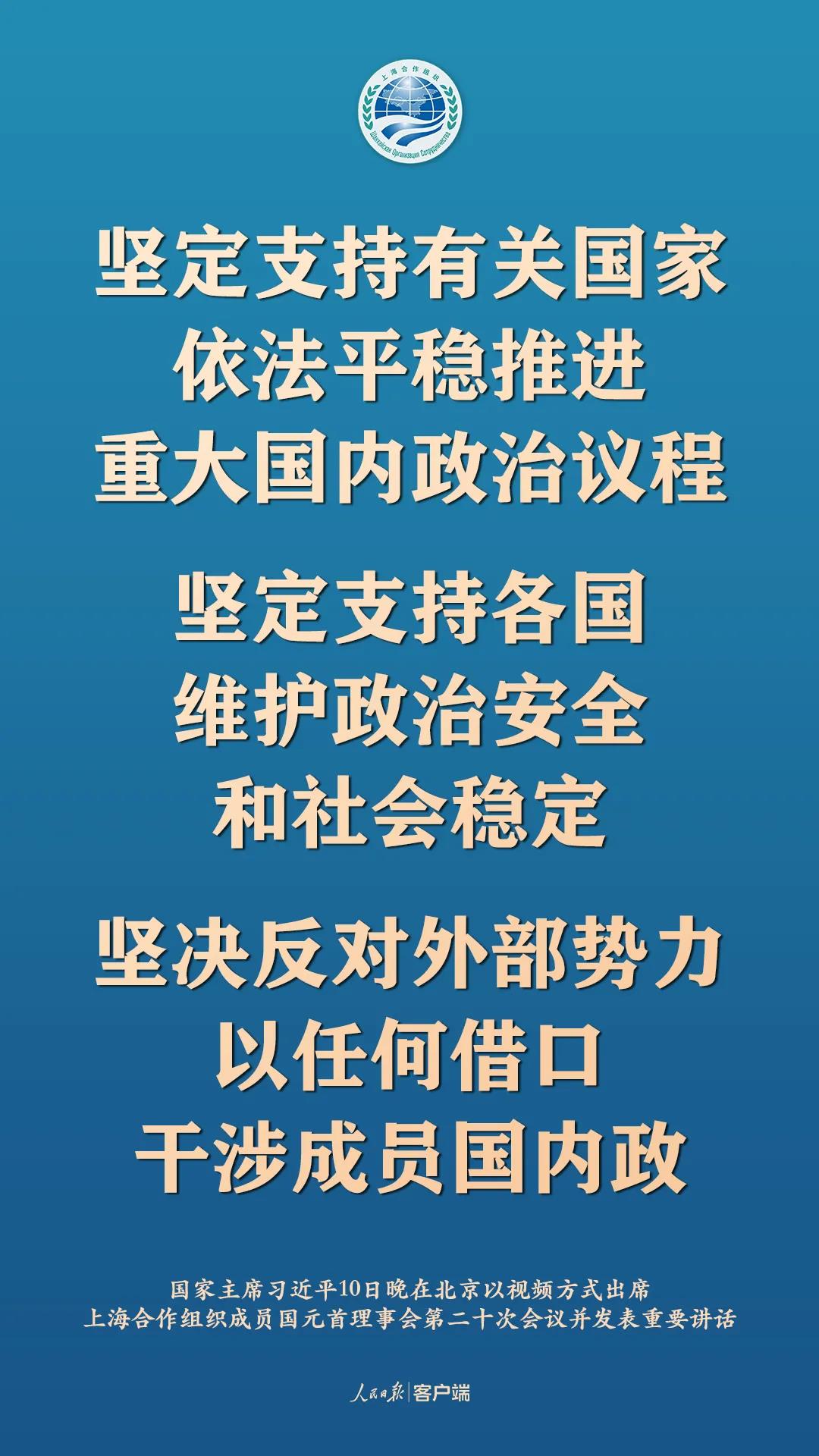 11月10日晚,國家主席習近平在北京以視頻方式出席上海合作組織成員國元首理事會第二十次會議並發表重要講話,以下為講話要點: