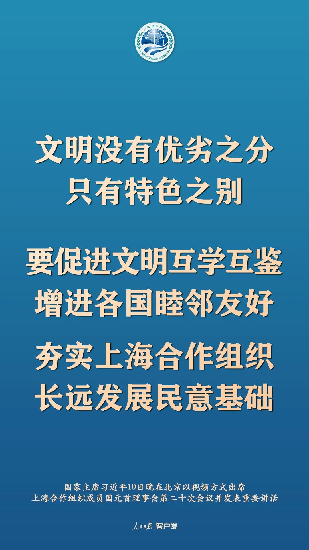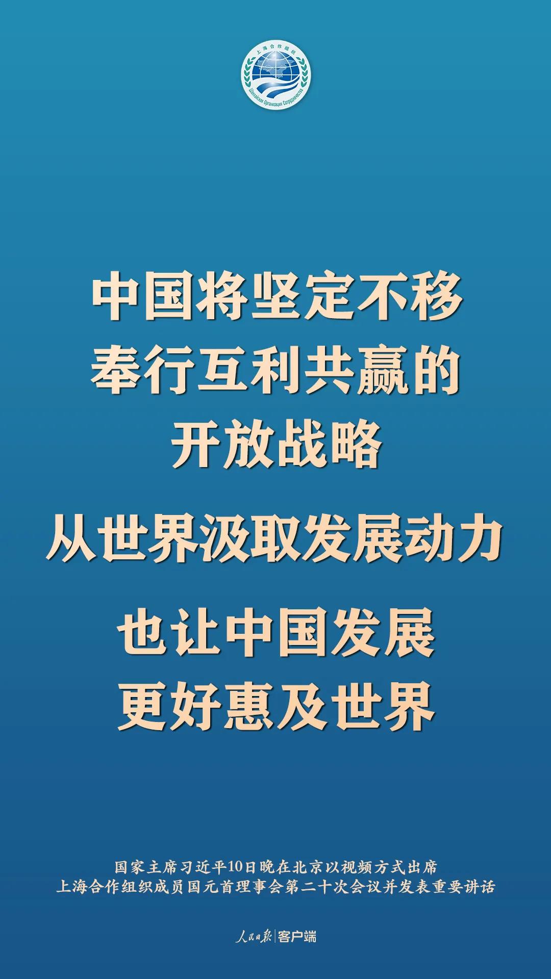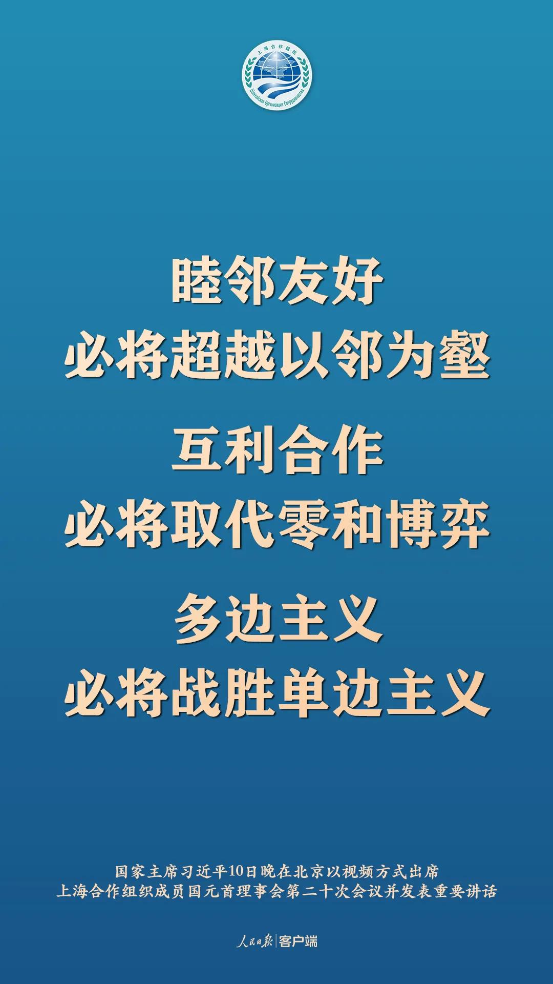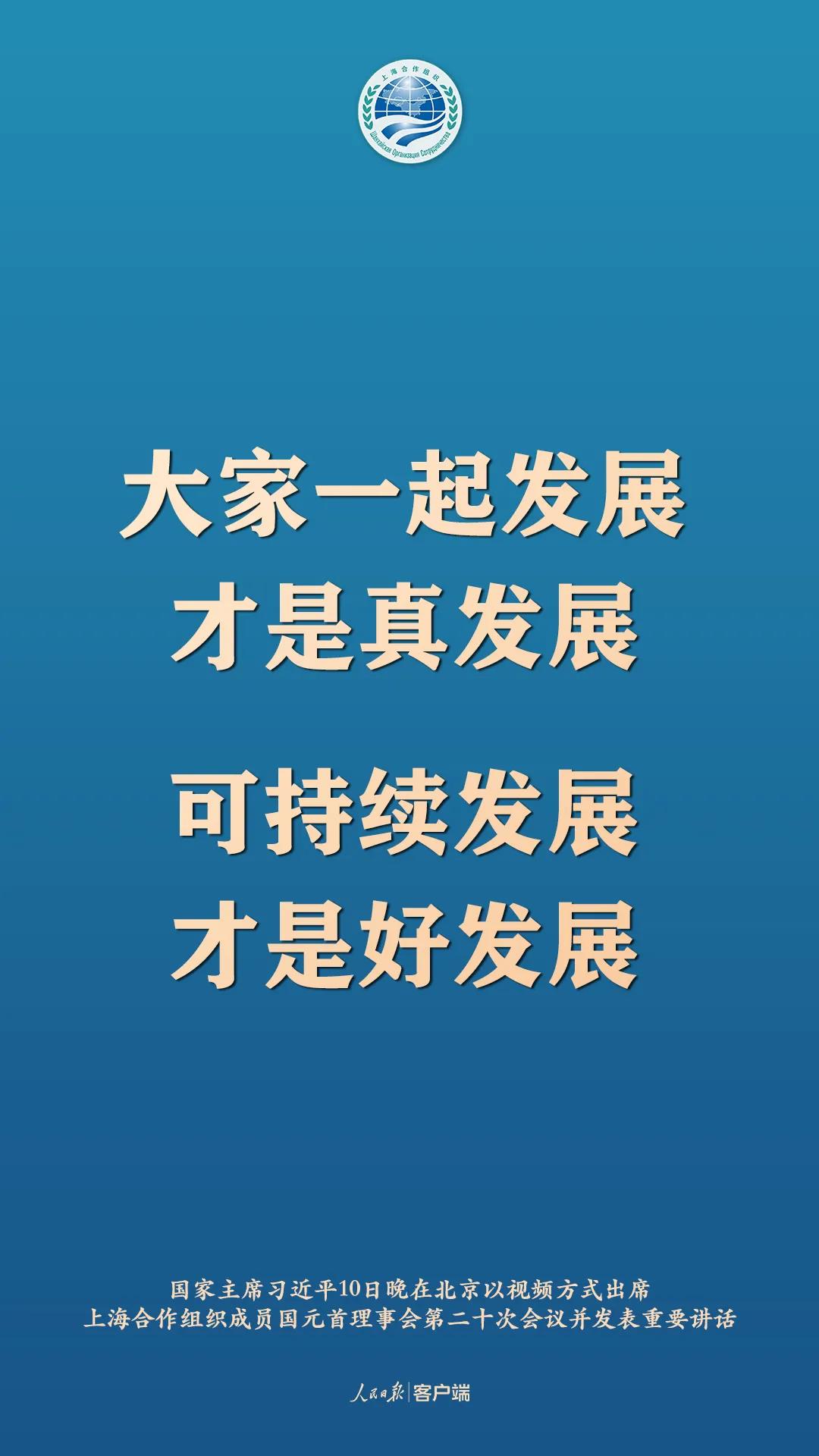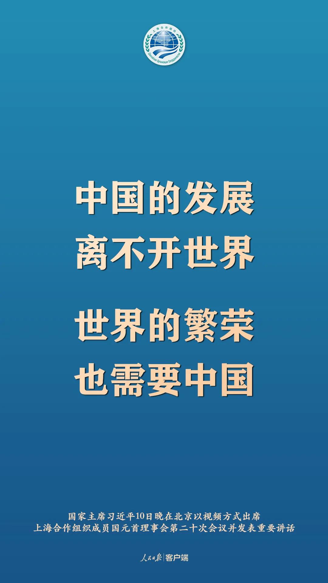 11月10日晚,國家主席習近平在北京以視頻方式出席上海合作組織成員國元首理事會第二十次會議並發表重要講話,以下為講話要點: