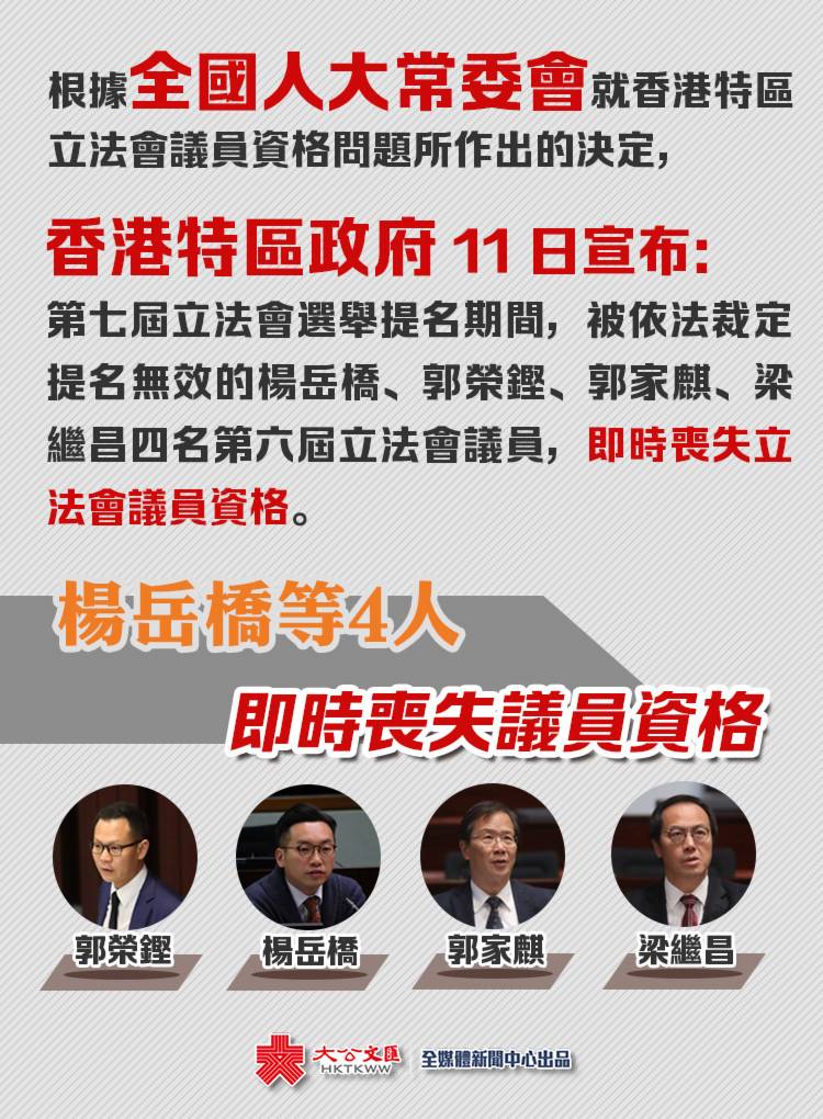 據香港政府新聞網消息,全國人民代表大會常務委員會(全國人大常委會)今日(11日)就關於香港特別行政區(特區)立法會議員資格問題作出決定。特區政府今日宣布,原定於2020年9月6日舉行的香港特別行政區第七屆立法會選舉提名期間,因決定第(一)段情形被香港特別行政區依法裁定提名無效的楊岳橋、郭榮鏗、郭家麒、梁繼昌四名第六屆立法會議員,即時喪失立法會議員資格。