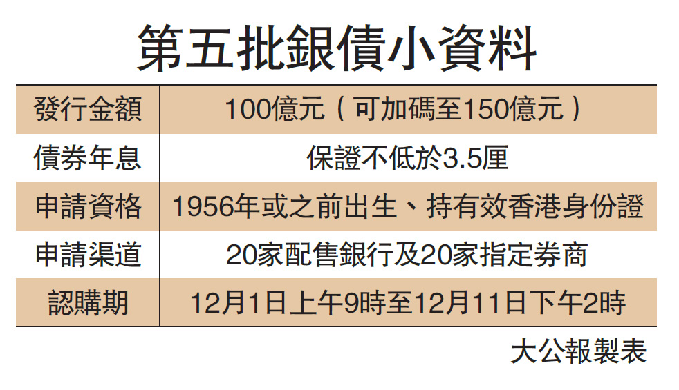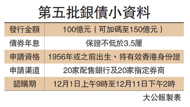 大公報報道,港府推出新一批面向「銀髮族」的銀色債券,發行金額由過往的30億元大幅提高至100億元,若反應理想可加碼至最多150億元;保證息率亦上調0.5厘至3.5厘,12月1日起接受認購。金管局為防大批銀債落入少數投資者手上,每名申請者最多可獲發100手債券,但不設二手市場。