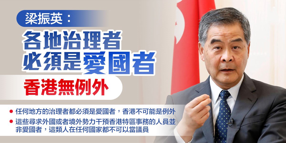 大公文匯全媒體報道,全國人大常委會昨日(11日)通過有關香港特區立法會議員資格問題的決定,特區政府隨即宣布4名攬炒派議員楊岳橋、郭榮鏗、郭家麒及梁繼昌喪失立法會議員資格。全國政協副主席梁振英今日於社交平台發文指,任何地方的治理者都必須是愛國者,香港不可能是例外。