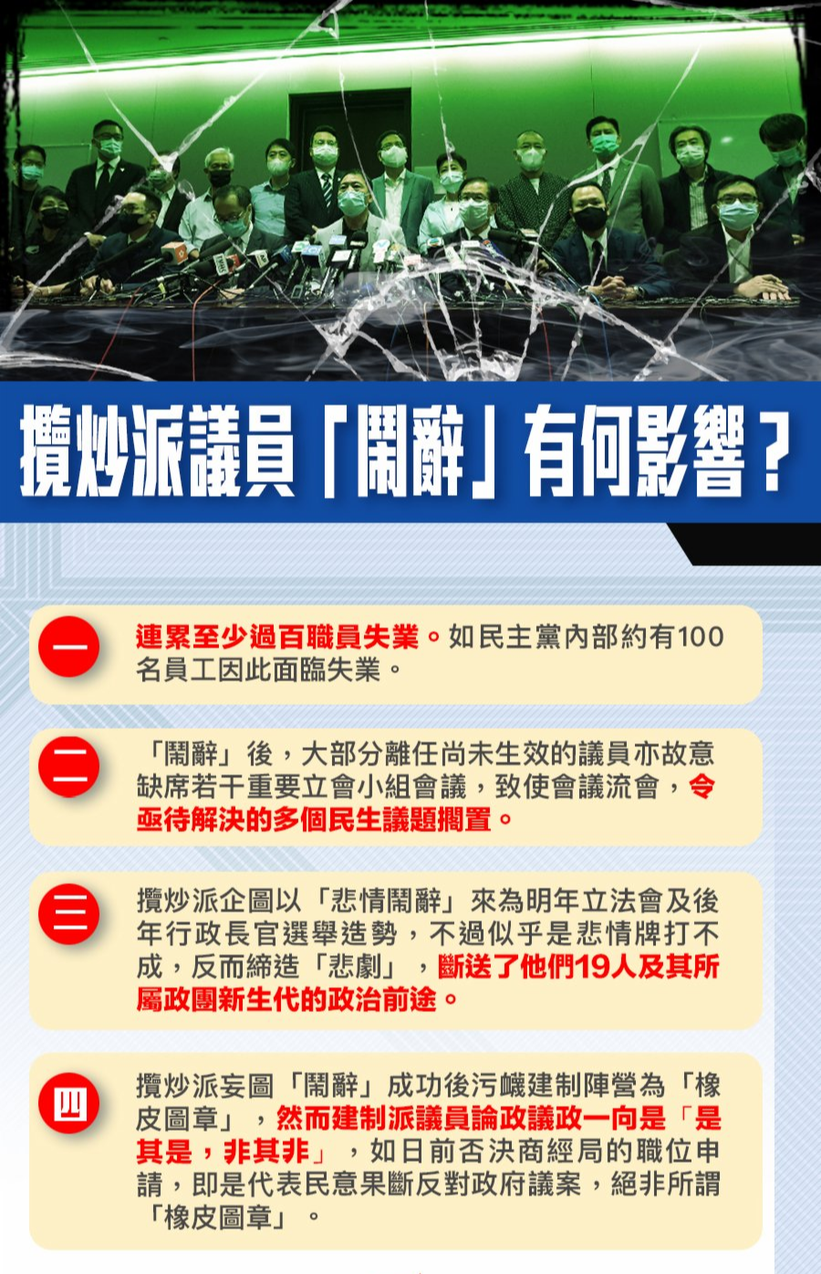 大公文匯全媒體報道,全國人大常委會11日表決通過了關於香港特別行政區立法會議員資格問題的決定,特區政府隨即宣布楊岳橋、郭榮鏗、郭家麒、梁繼昌即時喪失立法會議員資格。不過,15個攬炒派議員卻恬不知恥,要和DQ的四人捆綁「鬧辭」,放棄承擔議員責任。截至目前,15人均已向立會秘書處遞交辭呈,其中民主黨許智峯和「香港本土」毛孟靜的辭呈已於日前生效。然而這一「鬧辭」究竟帶來了哪些影響,請看下圖。