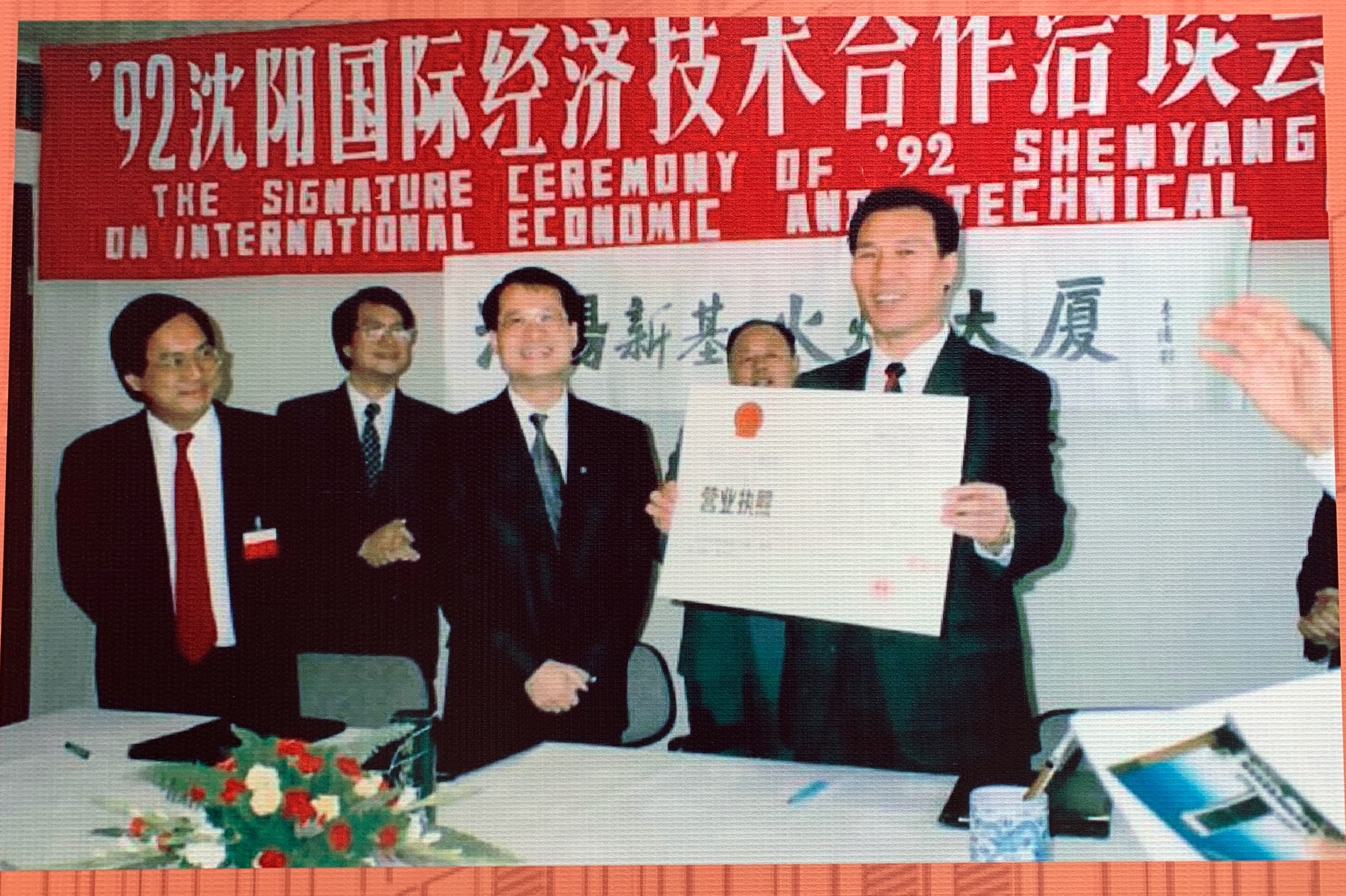 另一張老照片則記錄了工業重鎮瀋陽市在轉型期的里程碑式變化。1992年,時任瀋陽市副市長張瑞昌為新基火炬大廈頒發了營業執照,這座由蔡冠深帶領的新華集團合作投建的極具現代感的寫字樓大廈,不僅成為了這裏當時最高樓、第一座玻璃幕牆寫字樓,更成為世界五百強企業在瀋陽的辦公首選,也成為瀋陽乃至東北地區對外開放的重要見證地。