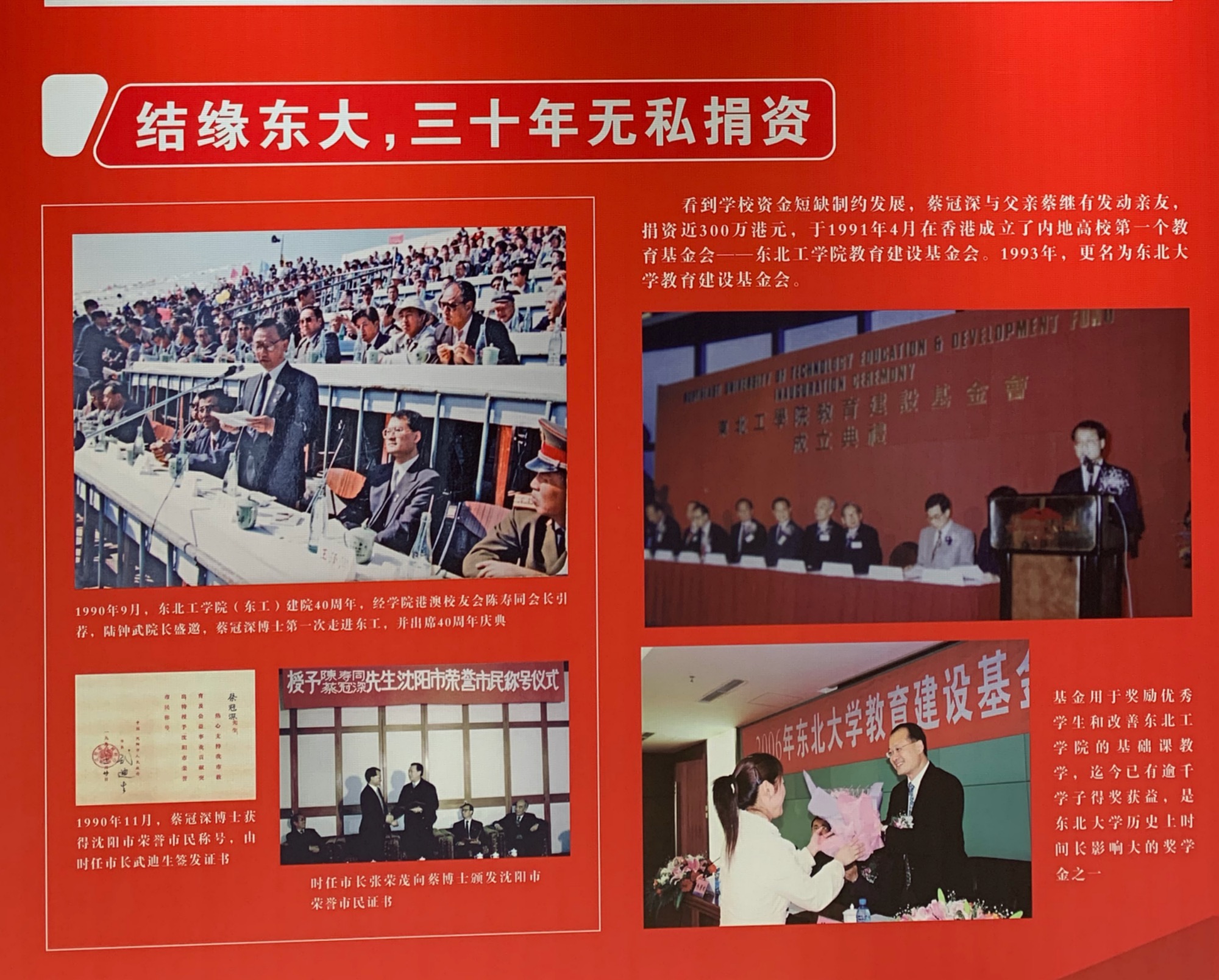 此次展出的圖片,以三個板塊共14部分凝練了蔡氏家族三代人愛國愛港愛遼的「家國情懷」。在回顧全國政協常委、香港中華總商會會長、香港新華集團主席蔡冠深在內地無私捐資的板塊中,一張老照片記錄了內地高校第一個教育基金設立的歷史瞬間。這張拍攝於1991年4月的照片背後,是蔡冠深及其父親蔡繼有的無私捐資。當時,他們在看到東北工學院(現東北大學)資金短缺制約發展後,發動親友捐資近300萬港元,在香港成立了東北工學院教育建設基金會,並延續至今成為東北大學教育建設基金會,讓逾千學子得獎獲益。