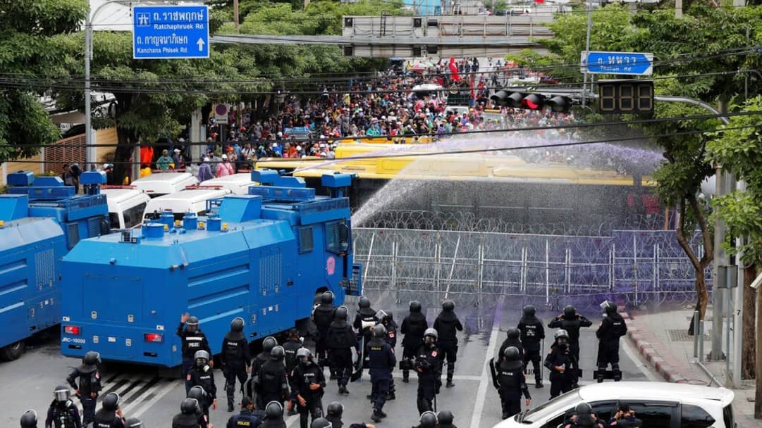 泰國國會一連兩日開會,今日(17日)再度辯論各個政黨以及民間團體提出的修憲草案。在泰國首都曼谷,有學生組織號召支持者包圍國會,警告假如國會不通過草案,將不會撤走,示威者投擲油漆和煙霧彈,嘗試越過警方設下的鐵絲網路障。警方出動水炮車發射紫色水劑和水炮,防暴警察發射催淚彈驅趕,雙方隔着路障對峙,曾經嘗試談判。