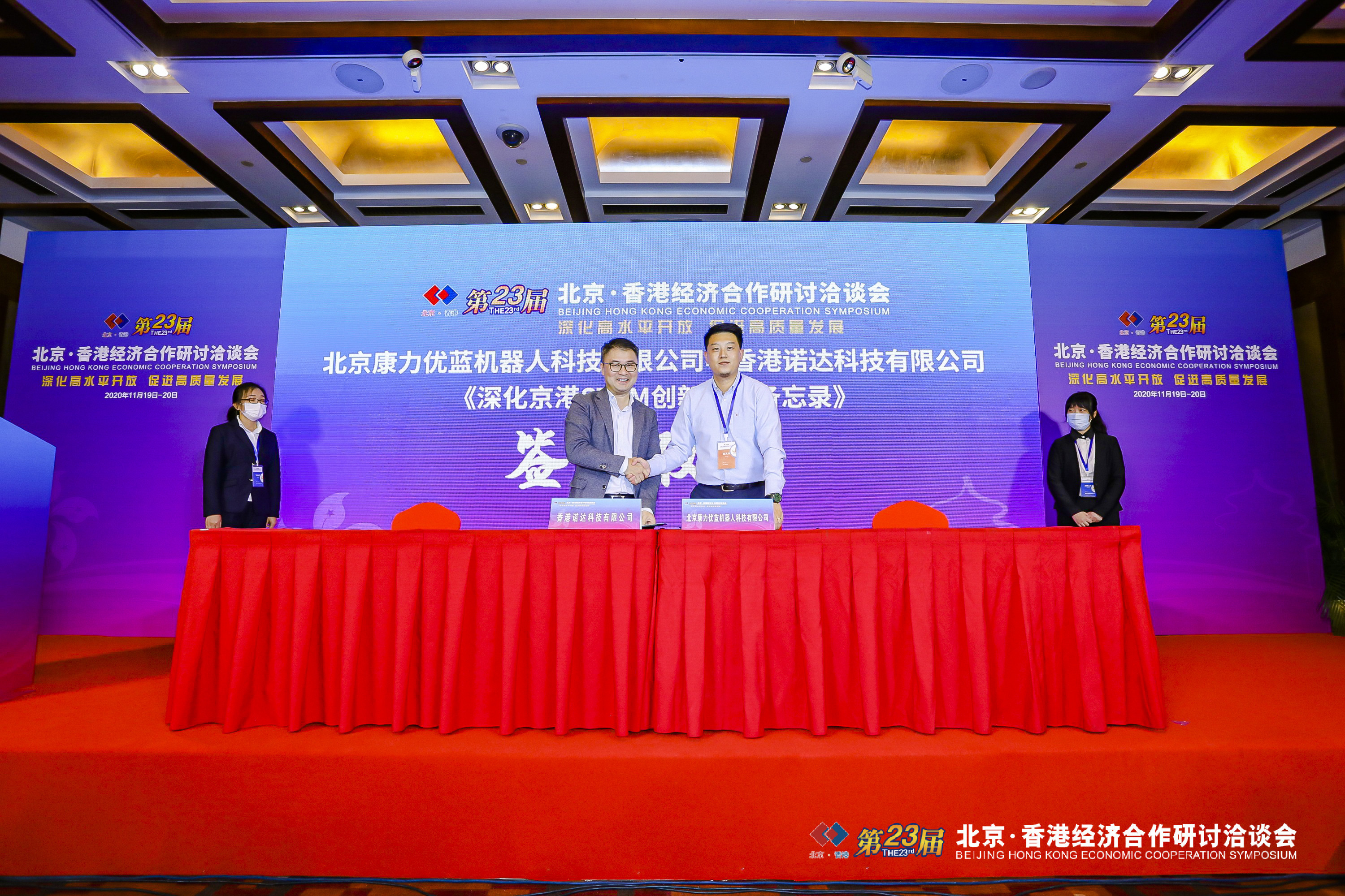 會上,來自香港的諾達科技對自主研發的機械人視覺路徑定位技術進行了路演。神州高鐵則帶來了軸承故障軌邊聲學診斷系統。活動期間還舉行了三場簽約儀式,分別為北京市科學技術開發交流中心與香港貿發局簽署《深化京港科技企業合作備忘錄》、北京科學技術開發交流中心與中國香港(地區)商會簽署《京港科技創新與區域產業發展合作備忘錄》,以及北京康力優藍機械人科技有限公司與香港諾達科技有限公司簽署《深化京港STEM創新合作備忘錄》。