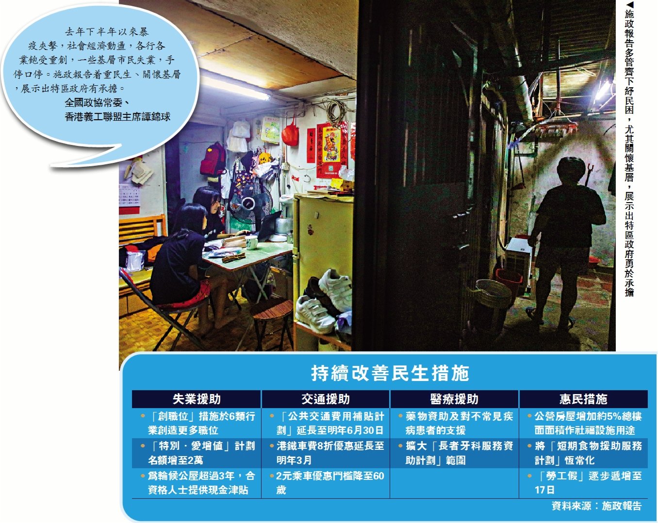 全國政協常委、香港義工聯盟主席譚錦球表示,暴疫夾擊,社會經濟動盪,各行各業受重創,基層市民失業手停口停。他稱讚施政報告貼地,着重民生,關懷基層,展示特區政府勇於承擔。