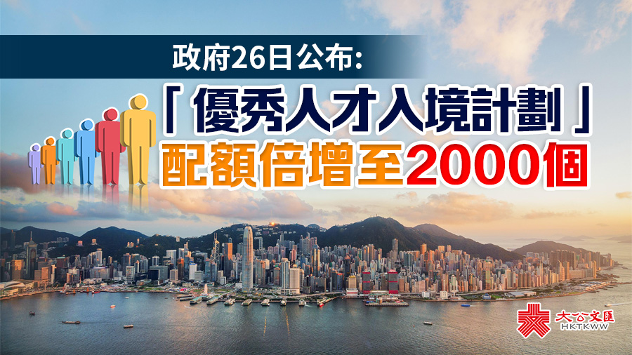 大公文匯全媒體報道,港府今日(26日)公布,「優秀人才入境計劃」(「優才計劃」)的配額將由每年1000名增加至2000名。