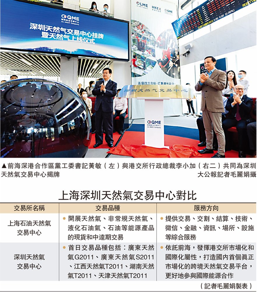 前海聯合交易中心是香港交易所與前海金融控股共同發起設立的大宗商品交易平台。前海聯合交易中心於今年6月獲批加掛「深圳天然氣交易中心」牌子,成為繼上海、重慶之後,全國第三個天然氣交易中心,現貨交易品種由金屬拓展到能源領域。