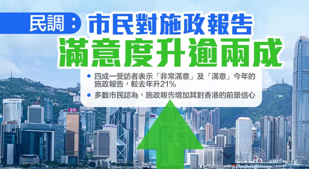 調查結果顯示:合共四成一受訪者表示「非常滿意」及「滿意」今年的施政報告,較去年升21%;而表示「一般」的則佔兩成三(+5%),反映市民對今年施政報告的評價較去年有相當明顯的改善。