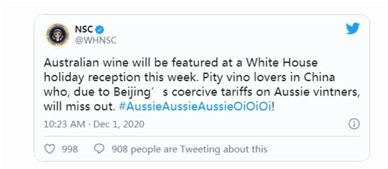 美國還想給中澳的貿易紛爭添一把火。北京時間12月1日上午,美國國家安全委員會發推稱,白宮將在本周的招待會上使用澳大利亞葡萄酒。此前,據中國商務部網站11月27日消息,根據《反傾銷條例》第二十八條和第二十九條的規定,調查機關決定採用保證金形式對原產於澳大利亞的進口相關葡萄酒實施臨時反傾銷措施。「澳大利亞葡萄酒將在本周的白宮假期招待會上亮相。由於北京對澳大利亞葡萄酒實行強制性關稅,可憐的中國葡萄酒愛好者將錯過好貨。」該委員會在推特上這樣寫道。