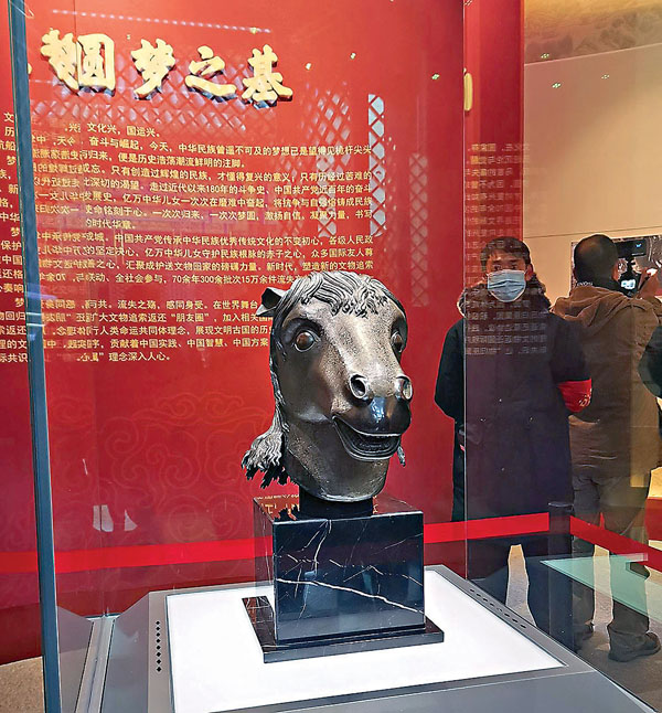 (香港文匯報記者 江鑫嫻)圓明園馬首銅像百餘年回家之路畫上圓滿句號。國家文物局昨日正式將這件文物劃撥北京市海淀區圓明園管理處收藏,《百年夢圓——圓明園馬首銅像回歸展》同期開展。國家文物局局長劉玉珠表示,馬首銅像結束百年流離,成為第一件回歸圓明園的流失海外重要文物。馬首回歸之路,匯聚黨和政府、港澳同胞磅礴力量,符合人民群眾殷切期待,詮釋着「民族弱則文物失,國運強則文化興」的深刻道理,同時也樹立了新時代流失文物回歸原屬地的成功範例。