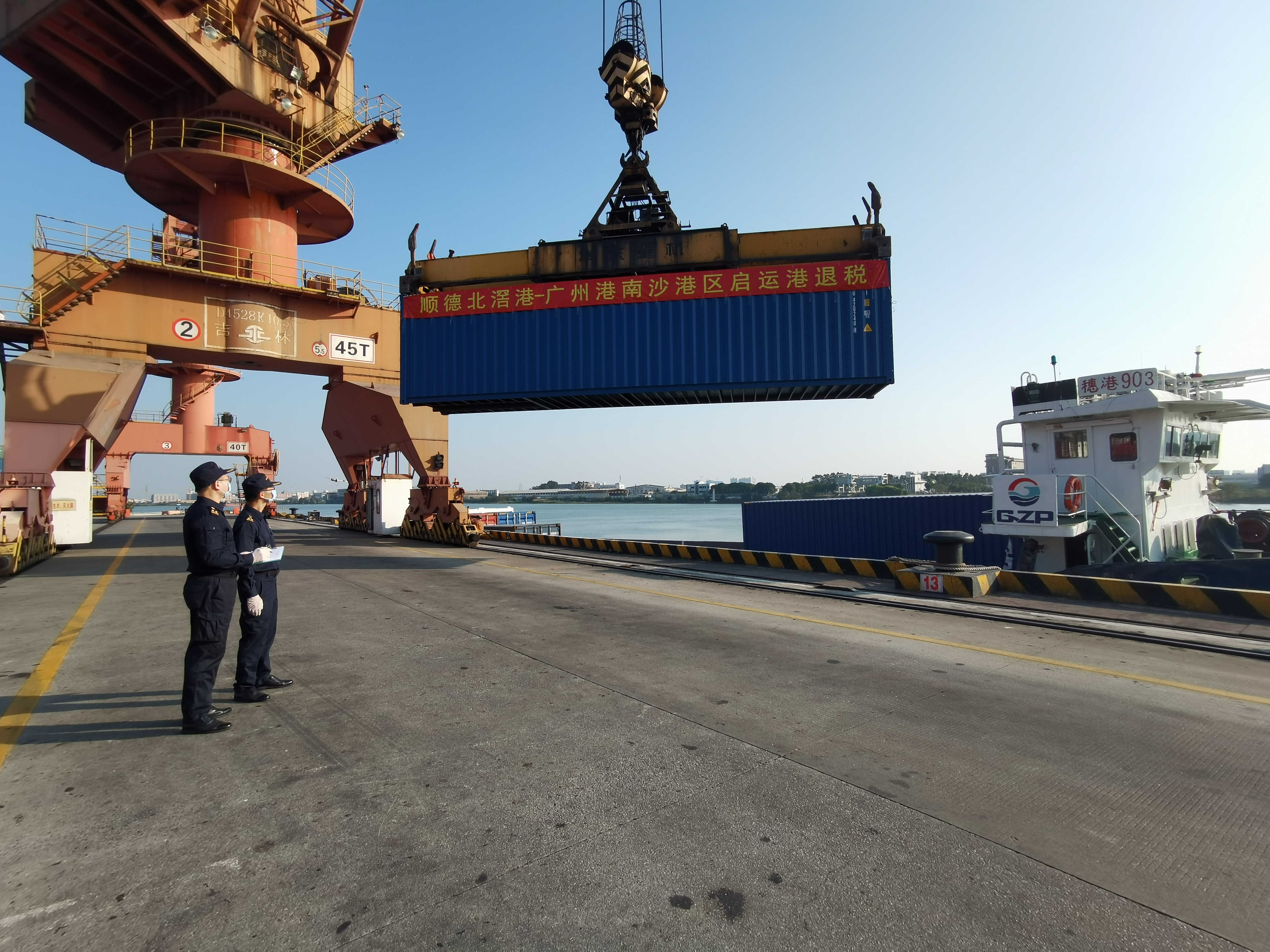 11月30日下午,美的集團等7家企業通過國際貿易「單一窗口」向廣州海關所屬佛山海關駐順德辦事處提前申報的啟運港退稅貨物陸續運抵佛山順德北滘港。這批貨物包括空調機、微波爐、摩托車配件等10949件、貨值680萬元人民幣,計劃從佛山北滘碼頭啟運至廣州南沙新港離境出口。海關在進行風險分析後對此票貨物作出放行處置,並在通關作業系統內對企業申報報關單數據加置「啟運港退稅」標記,並通過國際貿易「單一窗口」向稅務部門發送。