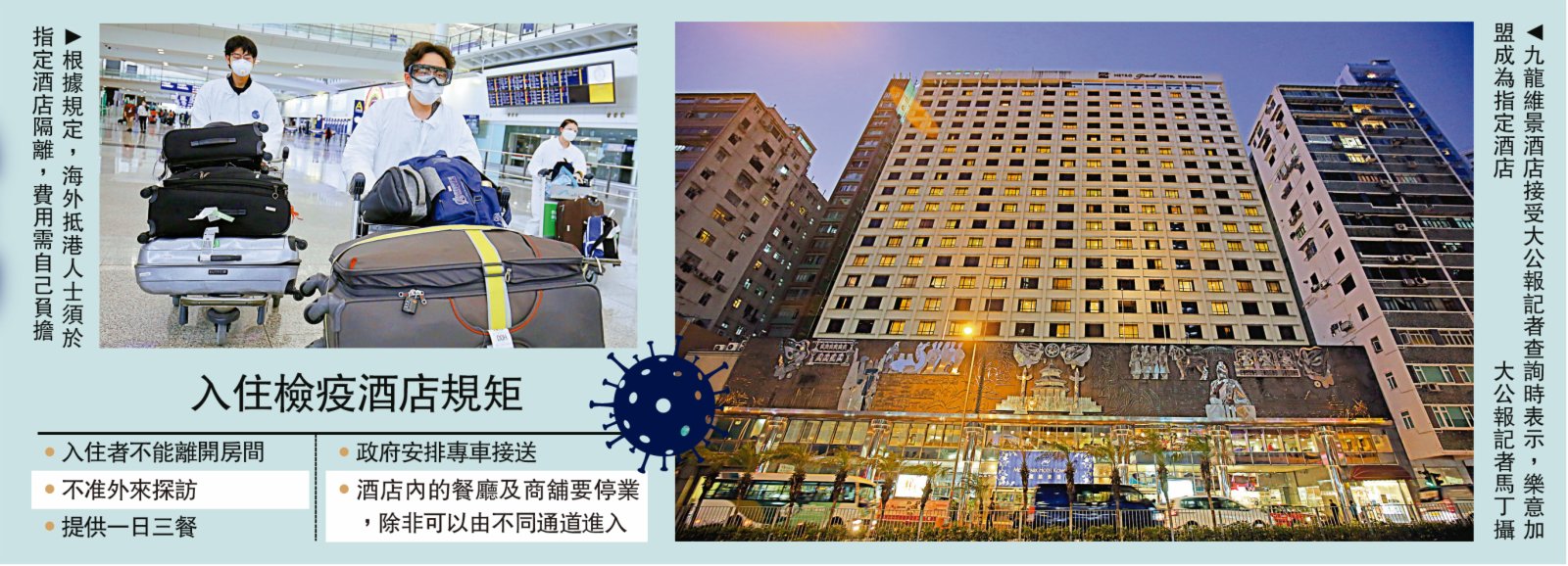 (大公報記者 馮錫雄)政府爭取於本月中設立指定酒店,專門接待返港人士自費入住隔離檢疫。消息稱,九龍維景酒店決定加入成為指定酒店,提供485個房間,酒店業界估計,最終會有約20間酒店參與,主要是三、四星級酒店。據悉,有關酒店最遲今日交回意向書,政府與酒店將簽訂60日租約,若入住率低於五成,政府會「包底」支付房租補貼。