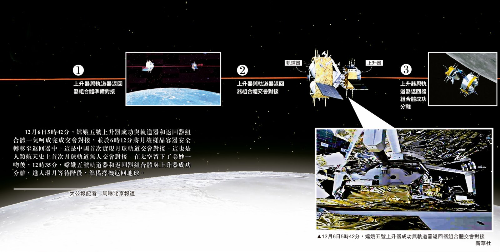 大公報報道,12月6日5時42分,嫦娥五號上升器成功與軌道器和返回器組合體順利完成交會對接,並於6時12分將月壤樣品容器安全轉移至返回器中。這是中國首次實現月球軌道交會對接。這也是人類航天史上首次月球軌道無人交會對接。在太空留下了美妙一吻後,12時35分,嫦娥五號軌道器和返回器組合體與上升器成功分離,進入環月等待階段,準備擇機返回地球。