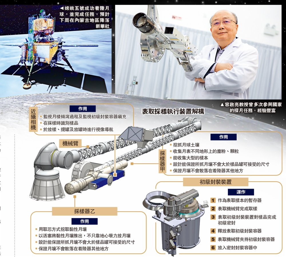 (大公報記者 湯嘉平 報道)嫦娥五號已於12月1日在月球表面軟着陸,當中理工大學研發的「表取採樣執行裝置」在同日完成了全自動的表土採樣及封裝任務,樣本多達兩公斤。正所謂「台上一分鐘,台下十年功」,負責研發相關裝置的理大教授容啟亮昨日在記者會上表示,該套裝置已研發七年,需要克服耐熱、無潤滑劑情況下的運作等高難度要求,今次的成功離不開之前的努力。據悉,載有月壤樣本的飛行器目前正返回地球,預計下周在內蒙古地區降落。這次是繼「火星相機」後,容啟亮再次帶領團隊參與國家太空任務。