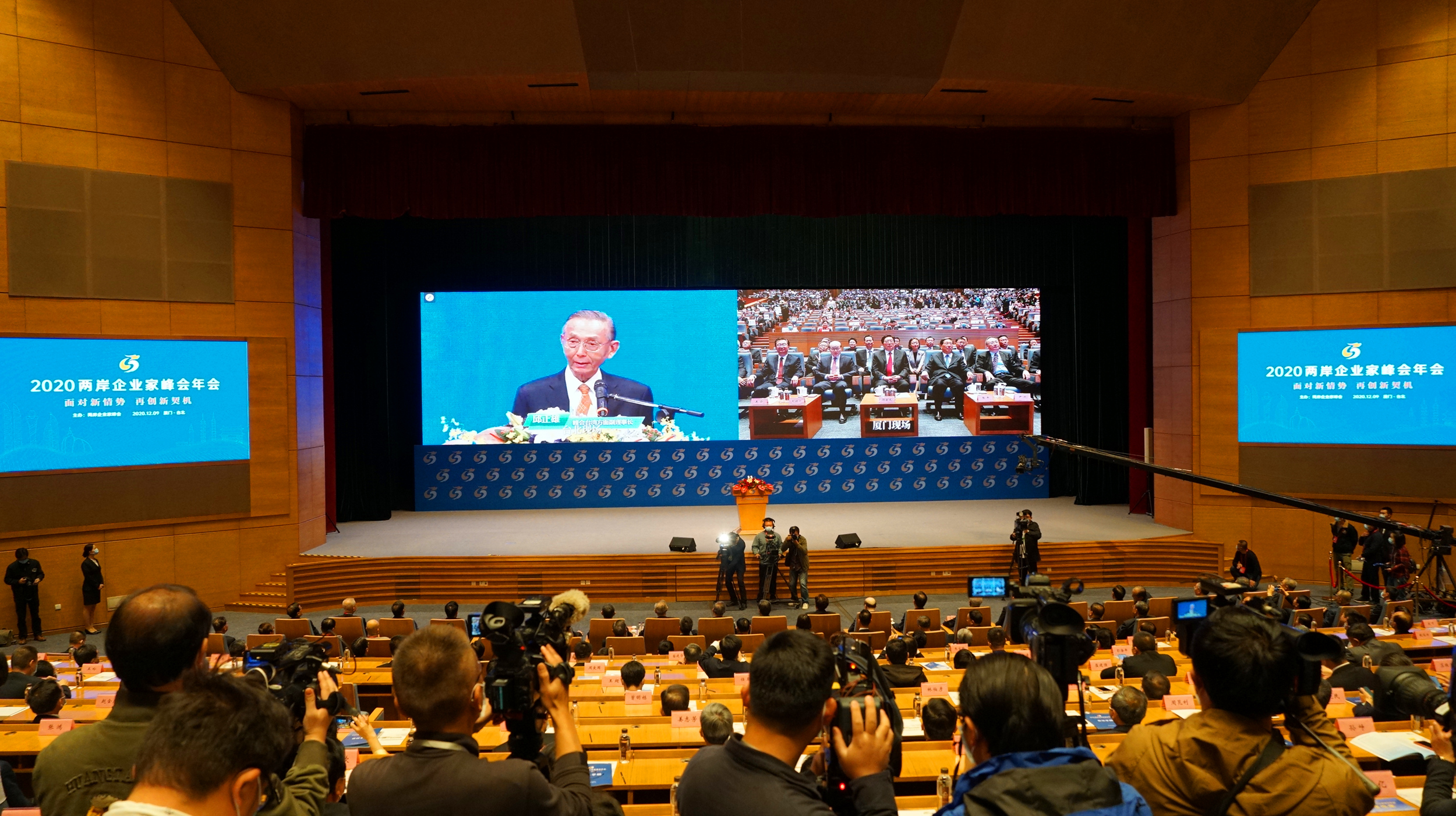 (大文新聞網 記者 蔣煌基)2020兩岸企業家峰會年會9日通過視頻方式在廈門與台北兩地舉行。台灣方面理事長蕭萬長因身體抱恙未蒞臨現場,由副理事長邱正雄宣讀蕭萬長致辭。蕭萬長鼓勵台企拓展大陸內需市場,推進兩岸在健康醫療、智慧城市等領域合作,希望大陸協助台商參與大陸新經濟建設,以及繼續深化落實惠台措施、協助解決台企困難等,以進一步擴大兩岸產業融合。