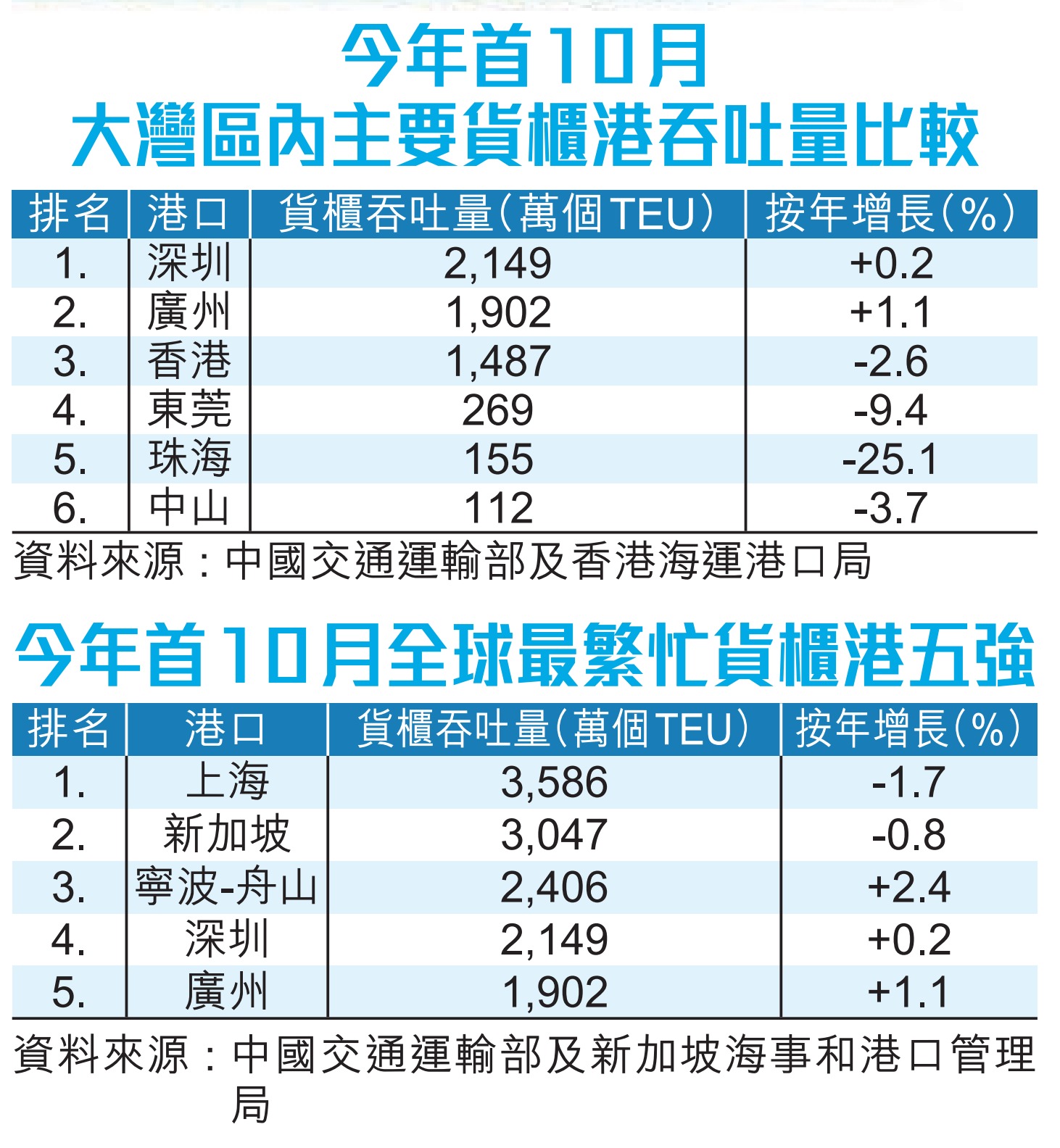 資料顯示,今年首10月,以上三大港口合共出口達5,538萬個貨櫃,當中香港首10月處理1,487萬個貨櫃,廣州同期處理1,902萬個貨櫃和深圳同期處理2,149萬個貨櫃,超過全球最大貨櫃港上海同期的3,586萬個貨櫃和全球第二位新加坡同期的3,047萬個貨櫃,實力不容忽視。