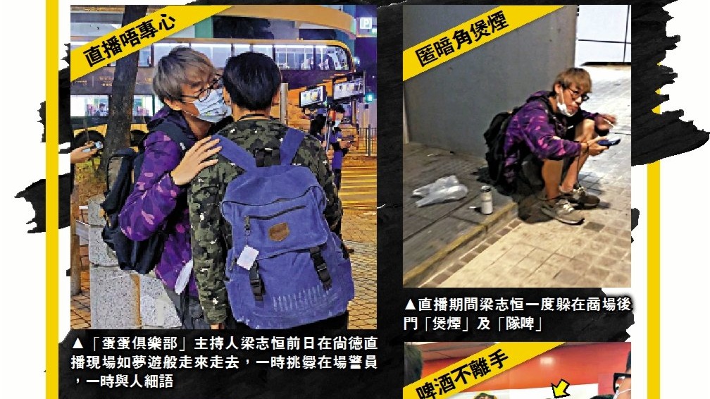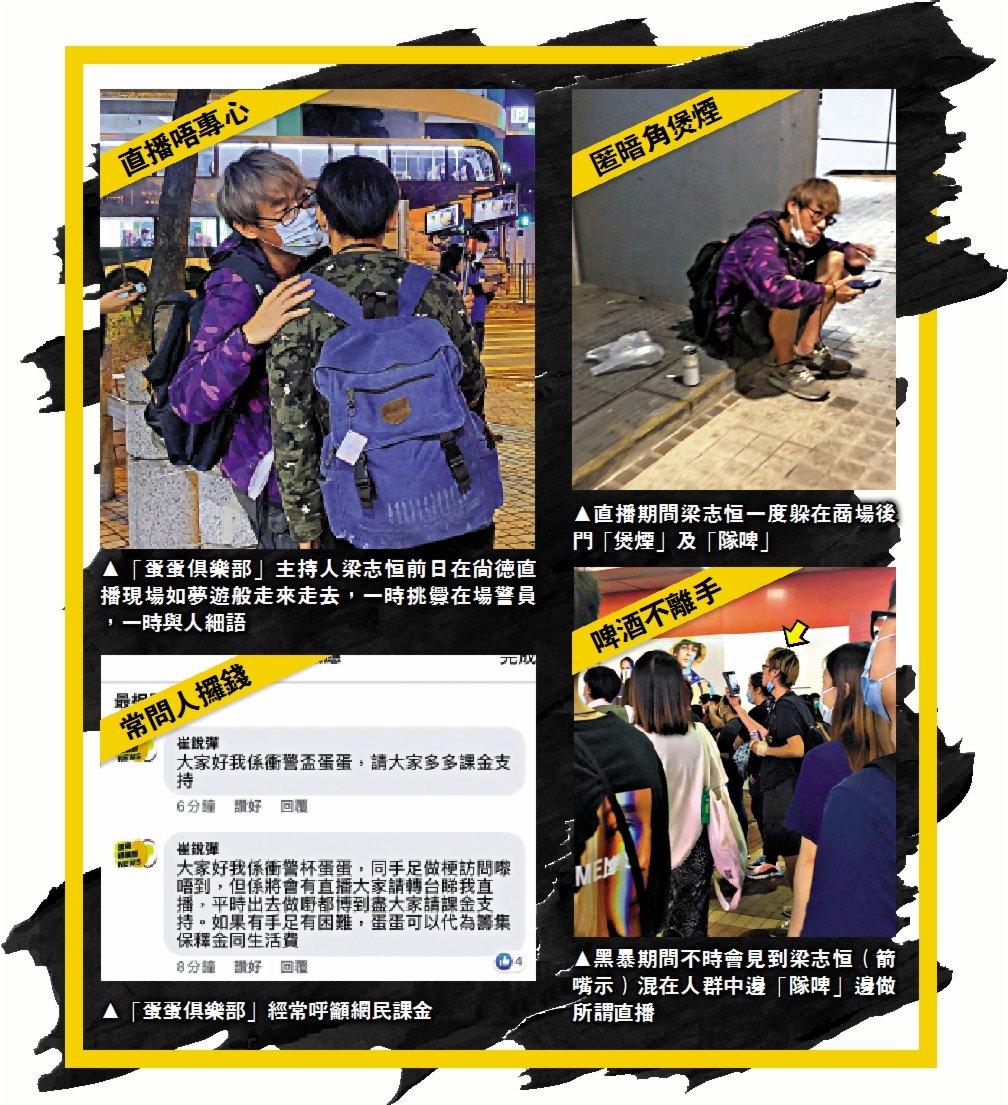 (大公報記者 黃浩輝 報道)香港的網媒一直處於「無王管」狀態,經常為人詬病,「黃媒」、「黑記」更借黑暴之亂崛起。大公報記者調查發現,2019年10月在社交網站Facebook開始運作的所謂網媒「蛋蛋俱樂部」,其主持人梁志恒曾與「港獨」組織「本土民主前線」關係密切,在旺角暴亂中掟鐵馬,又在多次暴亂中挑釁警方、阻礙執法,並刻意製作「仇警」短片上載互聯網賺取網民「課金」。至今梁志恒仍活躍於各場所謂「紀念」活動做直播,「無厘頭」挑釁警員。據悉,梁志恒一向行蠱惑,搞「黃媒」純為眾籌掠水。
