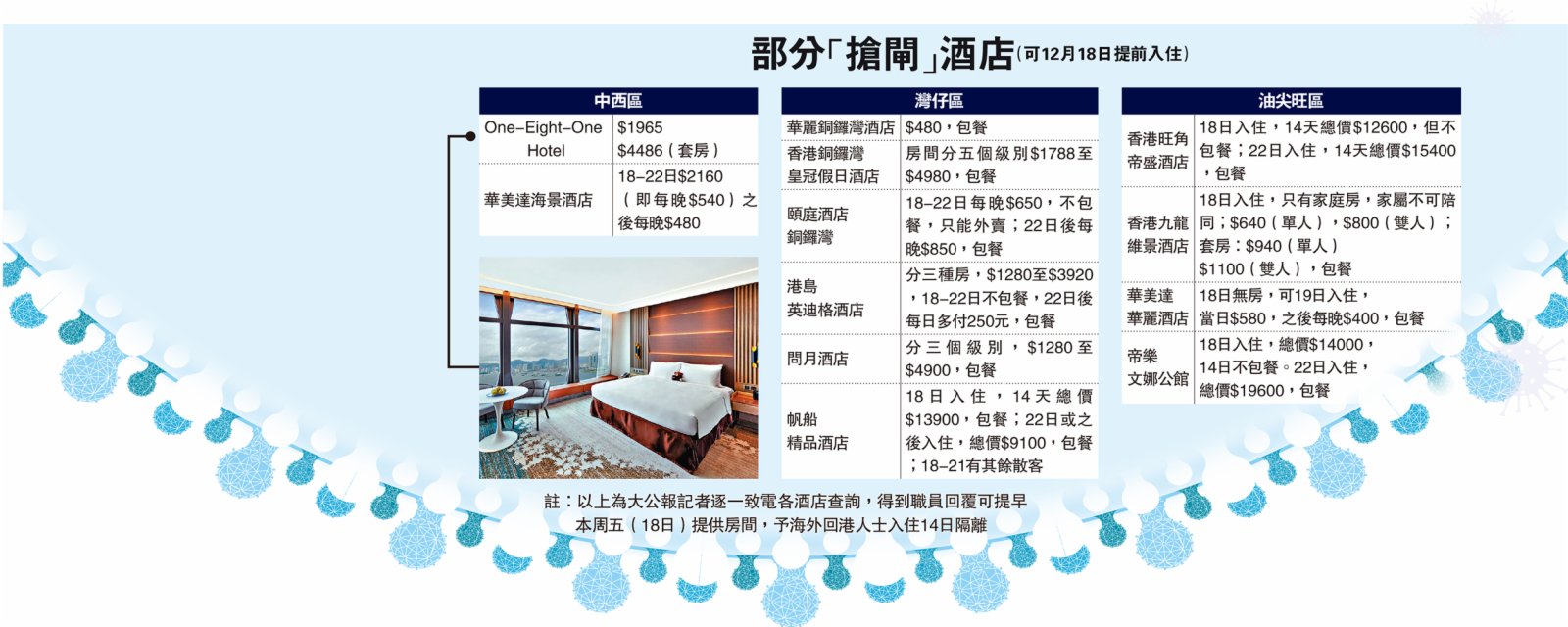 大公報記者昨日致電36間指定檢疫酒店,逐一了解預訂及服務情況,結果發現,最少12間酒店「搶閘」在本周五(18日)起收客,部分酒店首四天的房價,較政府公布的價目表,每晚略貴幾十元。有職員坦言,下周二計劃開始前,房價不包三餐,住客可另叫外賣,由職員送到門外。一間位於銅鑼灣的酒店,其職員坦言,18至21日仍有其他非檢疫散客居住,或可能不符合「只有接受檢疫人士入住」的要求。