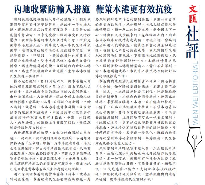 本港與內地經濟民生聯繫密不可分,供港物資「生命線」任何時候都保持暢通,本港才能不淪為「孤島」。本港防疫控疫不到位,控疫措施滯後於疫情發展,不能與內地同步防疫,後果正在浮現。事實擺在眼前,本港一日不能有效控疫,不能早一日與內地恢復正常往來,不僅本港基本民生受衝擊,各行各業復甦亦遙遙無期。本港亦要清醒認識到,抗疫問題不可能一味要求深圳、內地遷就本港,更不能以為即將有疫苗供應就否極泰來,若本港仍不採取最嚴密的防控措施,疫情遲遲沒有受控,甚至進一步惡化,難保內地還會再收緊對本港的來往限制,本港經濟、民生各方面或將承受更大巨力。