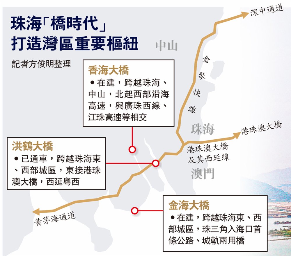 (大公報記者 方俊明 報道)珠海洪鶴大橋、金琴快線等4條快速通道15日通車,珠海隧道同時動工,為珠海加快打造「粵港澳大灣區重要門戶樞紐」注入新動能。其中,作為目前全球跨度最大的串聯式斜拉橋,洪鶴大橋促進港澳與珠海西部地區的聯動,並打通粵西直抵港珠兩地的大通道,從香港駕車到珠海金灣區較之前省時一半以上。而「金琴快線」建成,也意味着港澳─珠海─中山新增快速通道,構建大灣區西岸同時連通深中通道、深珠通道、港珠澳大橋3大跨江通道的縱向聯絡線。