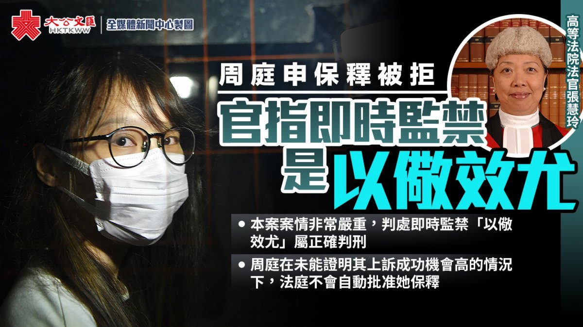 大公文匯全媒體報道,前「香港眾志」成員周庭涉嫌去年6月21日包圍灣仔警察總部,她早前承認煽惑他人明知而參與未經批准集結,以及參與未經批准集結罪,被判即時監禁10個月。她其後向高等法院申請保釋等候上訴,被法官張慧玲拒絕。張官今日(16日)頒下判詞,認為即時監禁是「以儆效尤」,裁判官判刑無不妥,亦沒有任何原則性錯誤。