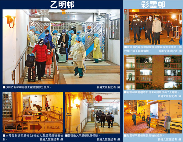 (香港文匯報記者 唐文)再有公屋爆發多宗確診個案,沙田乙明邨明恩樓先後有4個單位共6人染疫,其中在𨋢口同一邊3個單位4名患者均居於32樓細號數單位,衞生防護中心認為該樓層可能有超級傳播者污染環境,相關樓層部分居民需撤離。同時,彩雲邨明麗樓昨日增至6個單位共7人確診,其中3個單位是33號室,兩個是34號室,政府專家顧問、香港大學微生物學系講座教授袁國勇昨晚視察後懷疑喉管有問題,導致樓上樓下垂直傳播,政府即晚撤離該兩個坐向單位的所有居民。