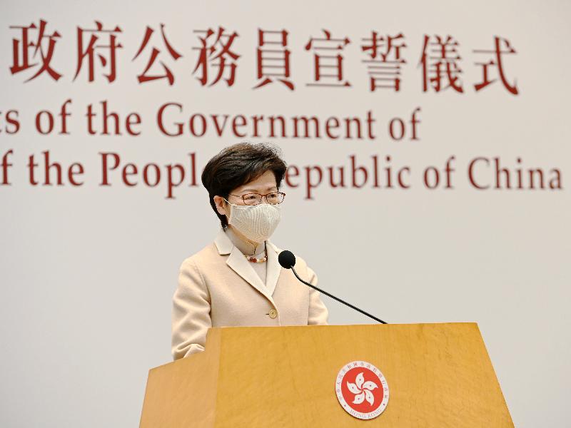 今日(18日)行政長官林鄭月娥出席中華人民共和國香港特別行政區政府公務員宣誓儀式并发表致辭。林鄭月娥表示,效忠中華人民共和國香港特別行政區、盡忠職守和對香港特區政府負責,是公務員的一貫責任及承擔,也是國家和社會大眾對於特區政府公務員必然的期望和要求。