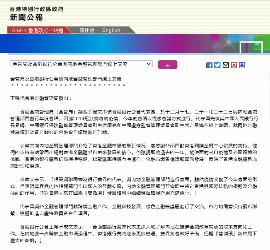 香港金融管理局(金管局)總裁余偉文率領香港銀行公會代表團,於十二月十七、二十一和二十二日與內地金融管理部門舉行年度會晤。因應2019冠狀病毒病疫情,今年的會晤以視像會議方式進行。代表團先後與中國人民銀行行長易綱、中國銀行保險監督管理委員會副主席周亮和中國證券監督管理委員會副主席方星海在線上會晤,就兩地金融發展情況及各方關心的金融合作議題進行討論。