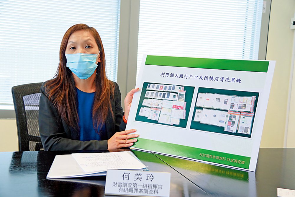 海關財富調查第一組指揮官何美玲表示,海關根據情報今年初鎖定一個懷疑洗黑錢集團,經九個多月的調查後,發現該洗黑錢集團於兩年前開始,先後開設逾百個個人銀行賬戶,處理多項不明來歷款項,涉款超過30億元,涉及6000多宗大額交易,當中1.7億交易來自被捕人的找換店。今年9月10日,海關認為時機成熟,出動30多名關員採取代號「獵影」行動,突擊搜查四個單位及上環一間找換店,拘捕四男二女,包括一個五人家庭及一名找換店持牌人,是海關歷來破獲的最大宗同類案件。