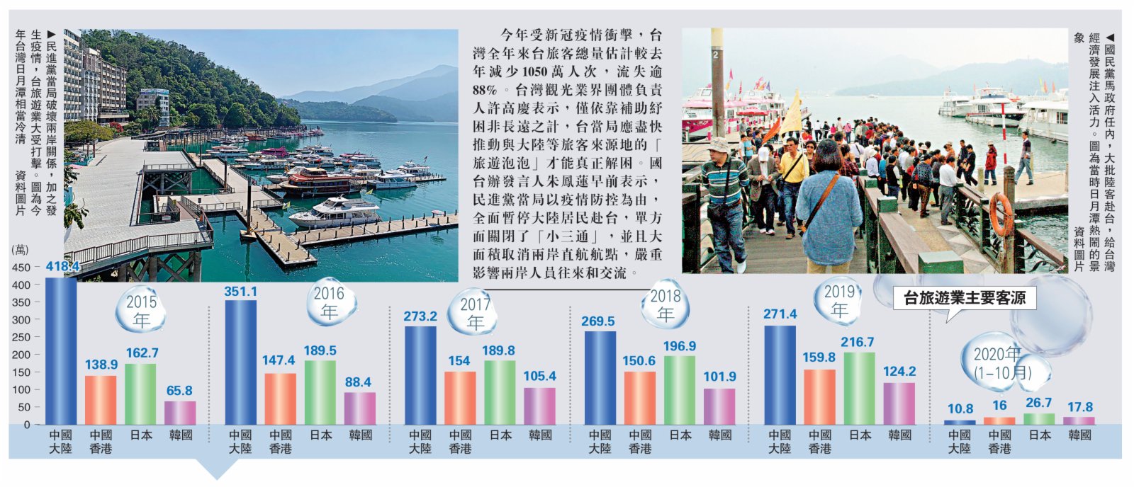 今年受新冠疫情衝擊,台灣全年來台旅客總量估計較去年減少1050萬人次,流失逾88%。台灣觀光業界團體負責人許高慶表示,僅依靠補助紓困非長遠之計,台當局應盡快推動與大陸等旅客來源地的「旅遊泡泡」才能真正解困。國台辦發言人朱鳳蓮早前表示,民進黨當局以疫情防控為由,全面暫停大陸居民赴台,單方面關閉了「小三通」,並且大面積取消兩岸直航航點,嚴重影響兩岸人員往來和交流。