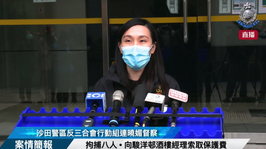 沙田警區反三合會行動組連曉媚督察介紹案情指,今年10月19日,駿洋邨商場一間酒樓向警方報案,稱酒店開業當日有7、8名男子向經理索取保護費,時隔兩日,再向經理打電話商討保護費金額。警方接報後,到酒樓附近調查,並高調巡邏,昨日下午2點左右發現涉案男子,被警方截查拘捕。現在8名男子正被警方扣留調查中。