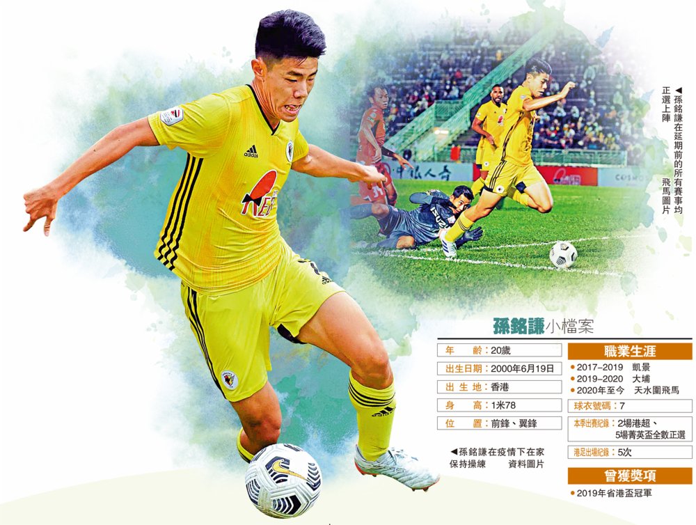 (大公報記者 張銳)香港最近受到新冠肺炎第四波疫情影響,導致新賽季的港超聯需延期等候復賽。不過即使比賽暫停,但球會仍會安排球員在家進行適度的訓練,以盡可能保持狀態。大公報記者獨家專訪了現時效力於港超聯球隊天水圍飛馬的港足超新星「孫銘」孫銘謙,講述他現時在疫情下的生活,和球隊的近況。