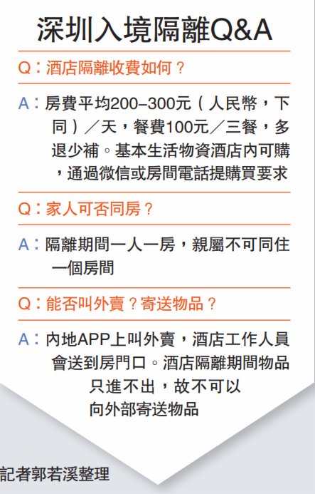 因為北上人士驟增,深圳隔離酒店一房難求,鄭先生被安排在東莞指定酒店進行14天隔離。「我們入住的酒店也在嚴密的隔離狀態,酒店幾米外就設有封鎖欄杆,到達酒店後,還需要進行一次登記和檢查,酒店有專門的醫務處,負責我們的核酸檢測和每日三次體溫測量,每個人房間內也有溫度計等防疫物資,入住酒店和結束隔離都要進行核酸檢測。」
