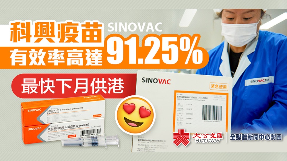 (大文新聞網記者 劉凝哲)即將供港的國產新冠滅活疫苗----北京科興研發的「克爾來福」,公布首個三期臨床數據。據外媒引述土耳其衞生部長官員表示,科興生物的新冠疫苗3期臨床試驗中顯示91.25%的有效性。