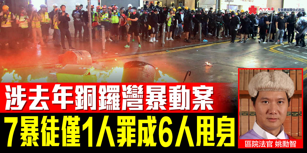 大公文匯全媒體報道,去年8月31日,反中亂港分子在港島發起多處遊行及集會,7名男女當晚在銅鑼灣及灣仔一帶參與暴動,其後被警方拘捕,他們今天(28日)在區域法院提訊。裁判官姚勳智裁定被告陳佐豪「暴動罪」及「無牌管有無線電通訊器具罪」兩罪罪成,宣布其案件押後至下月18日判刑;而其餘6名被告均罪名不成立。