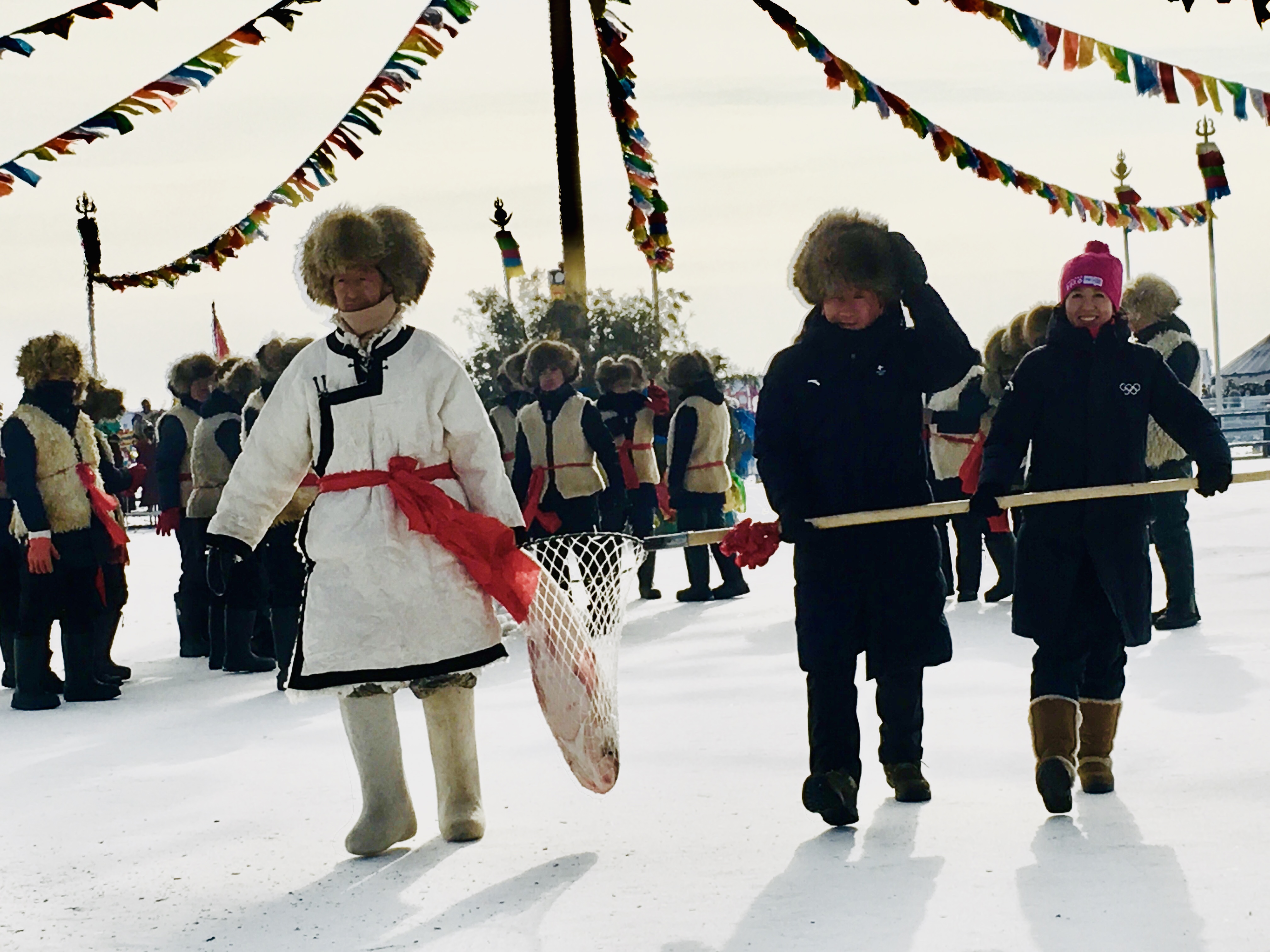 查乾湖冬捕盛於遼金時期,歷經千年迄今仍保留着原始的蒙古族捕魚方式。一米厚的冰層上,漁民每隔八、九米鑿一個冰眼,一網要鑿出幾百個冰窟窿,然後穿竿引繩,將2000多米的大拉網慢慢舒展成一個碩大的「包圍圈」。整個下網的過程要持續近九個小時。收網時,用馬拉動絞盤牽引着鋼絲繩轉動,大網裹着冰層下的魚群緩緩露出冰面。
