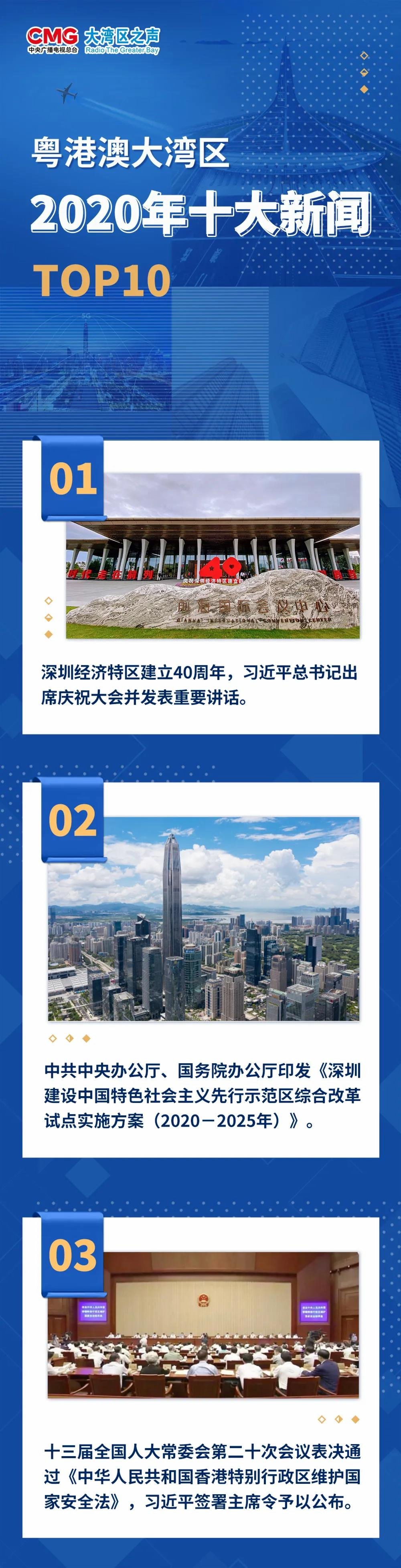 據了解,「深圳經濟特區建立40周年,習近平總書記出席慶祝大會並發表重要講話」,位列2020年粵港澳大灣區十大新聞的首位。據新華社報道,習近平在大會上發表重要講話強調,新形勢需要新擔當、呼喚新作為,必須全面準確貫徹「一國兩制」基本方針,促進內地與香港、澳門融合發展、相互促進。他指出,深圳要推進粵港澳大灣區建設,豐富「一國兩制」事業發展新實踐,率先實現社會主義現代化;要抓住粵港澳大灣區建設重大歷史機遇,推動三地經濟運行的規則銜接、機制對接,努力續寫更多「春天的故事」。