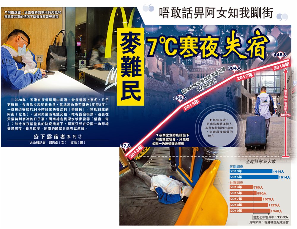 (大公報記者 郭恩卓、文澔)2020年,香港在疫情蹂躪中度過。當疫情遇上寒冬,日子更難捱。今日除夕和明日元旦,氣溫將急降至攝氏7度至8度。一群被迫寄居於24小時營業快餐店的「麥難民」,包括38歲的阿南(化名),因為失業而無錢交租,唯有露宿街頭,過去在天氣特別寒冷的日子裏,阿南總會到深水埗麥當勞「借宿一宵」;如今在夜禁堂食的防疫措施下,阿南只好在公園一角瑟縮捱過寒夜。新年即至,阿南的願望只想有瓦遮頭。