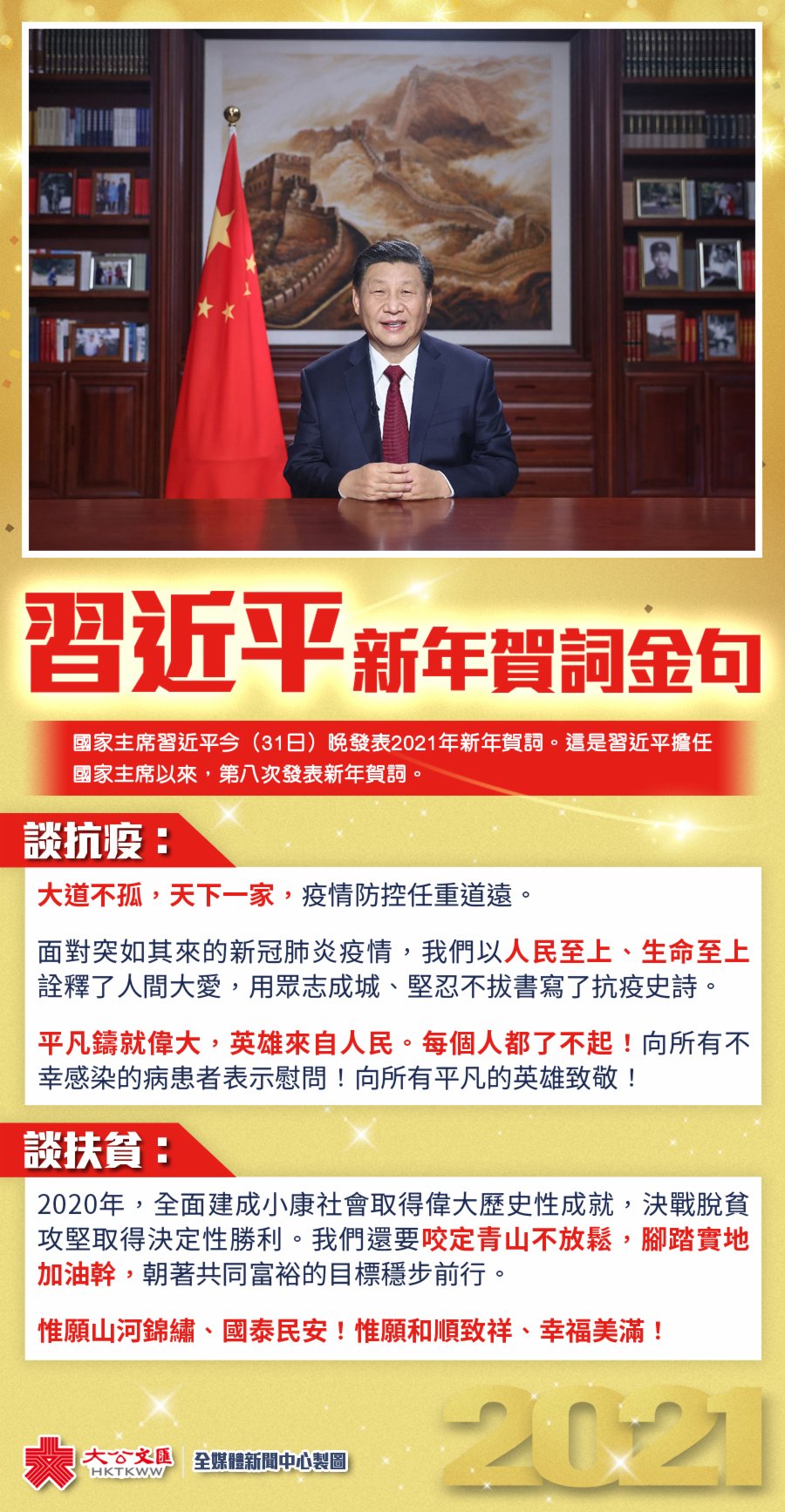 大公文匯全媒體報道,國家主席習近平今日(31日)發表2021年新年賀詞。習近平指出,中國克服疫情影響,統籌疫情防控和經濟社會發展取得重大成果,「十三五」圓滿收官,「十四五」全面擘畫,中國在世界主要經濟體中率先實現正增長,預計今年國內生產總值邁上百萬億元新台階。
