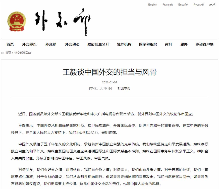 外交部網站今日(2日)刊發國務委員兼外交部長王毅接受新華社和中央廣播電視總台聯合採訪全文。就外界對中國外交的議論王毅作出回應,王毅表示中國外交承擔著維護國家利益、捍衛民族尊嚴、開展國際合作、促進世界和平的重要職責。