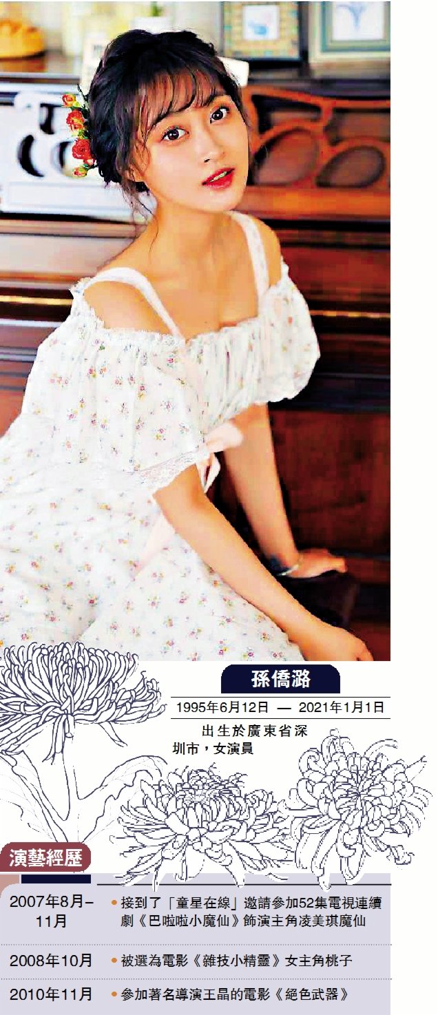 (大公報記者 黃寶儀)5歲登台,13歲主演《巴啦啦小魔仙》美琪的孫僑潞,突發心肌梗塞,送到醫院時已沒有救回的希望。孫僑潞媽媽2日下午通過微博發文證實年僅25歲的女兒去世的消息,網友紛紛留言表示惋惜,稱「魔仙堡需要她了,她去拯救魔仙堡了……」不過,坊間亦有傳言指孫僑潞在杭州飲酒,疑似因為飲酒過度,導致這樣的情況發生,而孫僑潞本人也曾在過往的視頻中,提到過每年要花幾百萬元去喝酒。